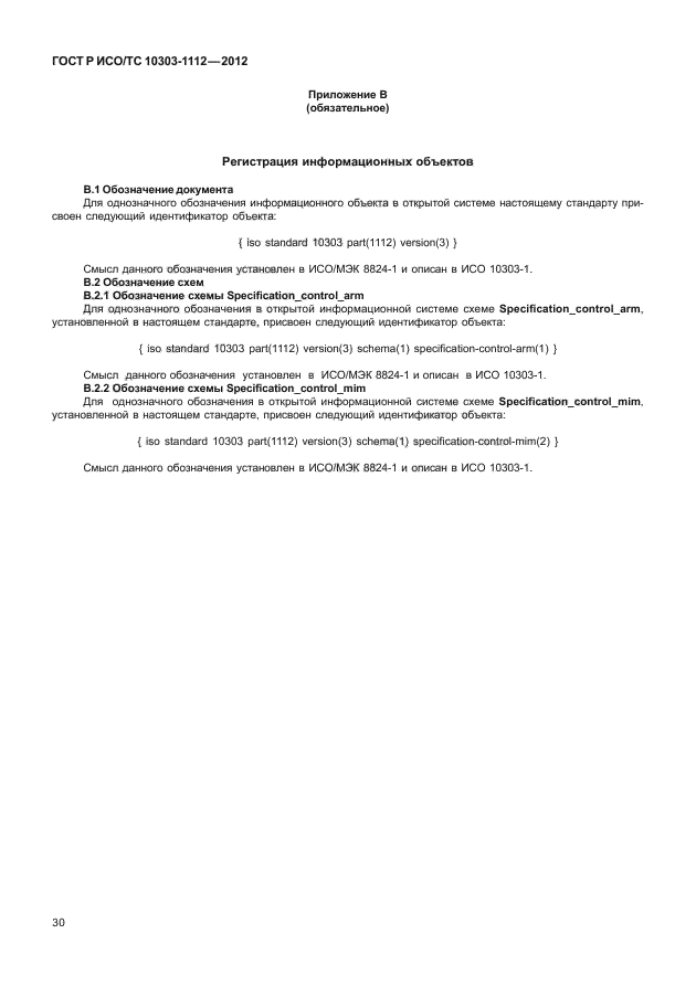 | Название рус.: | Системы автоматизации производства и их интеграция. Представление данных об изделии и обмен этими данными. Часть 1112. Прикладной модуль. Управление конфигурацией с помощью спецификаций |