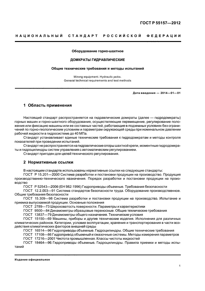 Настоящий стандарт распространяется на гидравлические домкраты (далее - гидродомкраты) горных машин и горно-шахтного оборудования, осуществляющие перемещение, регулирование положения или фиксацию машины или ее составных частей, работающие в подземных условиях без ограничений по горно-геологическим условиям и параметрам окружающей среды при номинальном давлении рабочей жидкости в гидросистеме до 40 МПа.