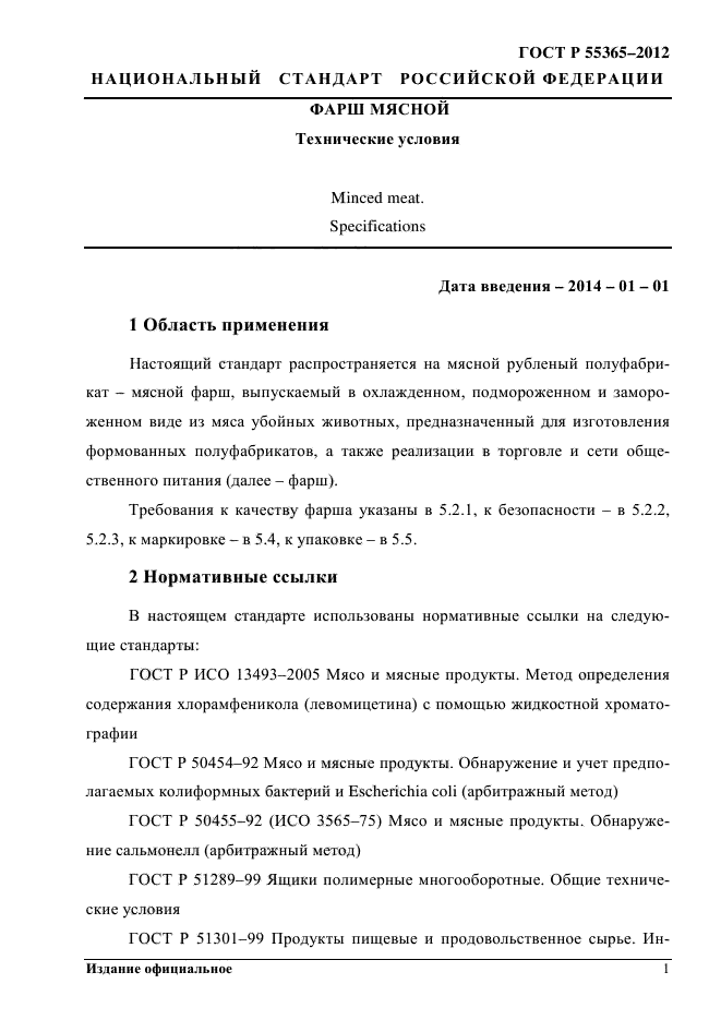 | Область и условия применения: | Настоящий стандарт распространяется на мясной рубленый полуфабрикат - мясной фарш, выпускаемый в охлажденном, подмороженном и замороженном виде из мяса убойных животных, предназначенный для изготовления формованных полуфабрикатов, а также реализации в торговле и сети общественного питания (далее - фарш).