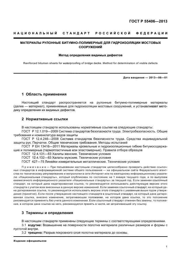 Настоящий стандарт распространяется на рулонные битумно-полимерные материалы (далее - материал), применяемые при гидроизоляции мостовых сооружений, и устанавливает методику определения их видимых дефектов