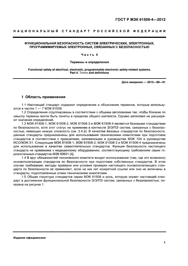 | Область и условия применения: | Настоящий стандарт содержит определения и объяснения терминов, которые используются в частях 1 - 7 МЭК 61508.