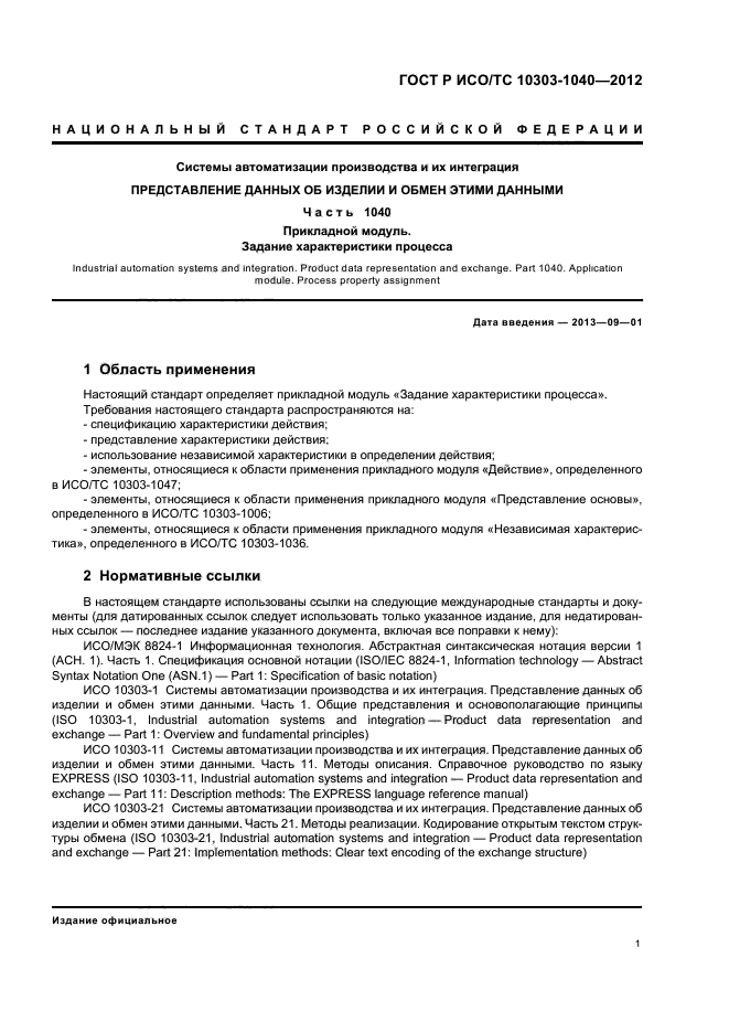 | Название рус.: | Системы автоматизации производства и их интеграция. Представление данных об изделии и обмен этими данными. Часть 1040. Прикладной модуль. Задание характеристики процесса |