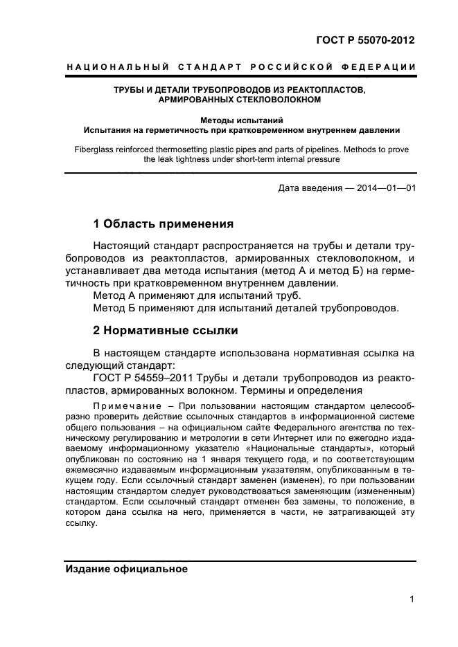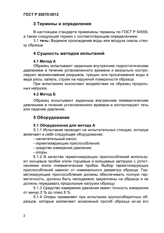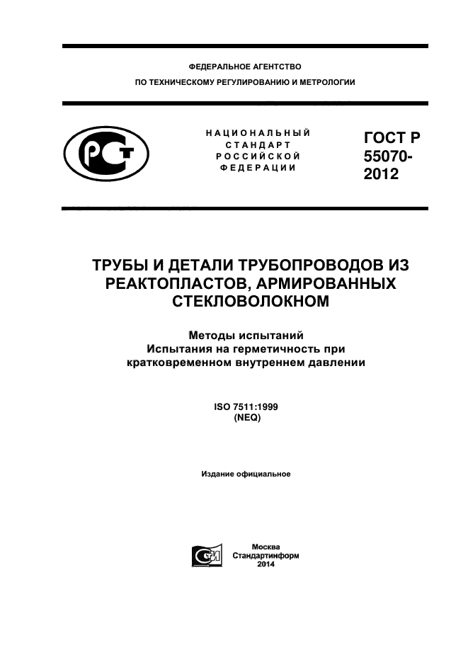Настоящий стандарт распространяется на трубы и детали трубопроводов из реактопластов, армированных стекловолокном, и устанавливает два метода испытания (метод А и метод Б) на герметичность при кратковременном внутреннем давлении.