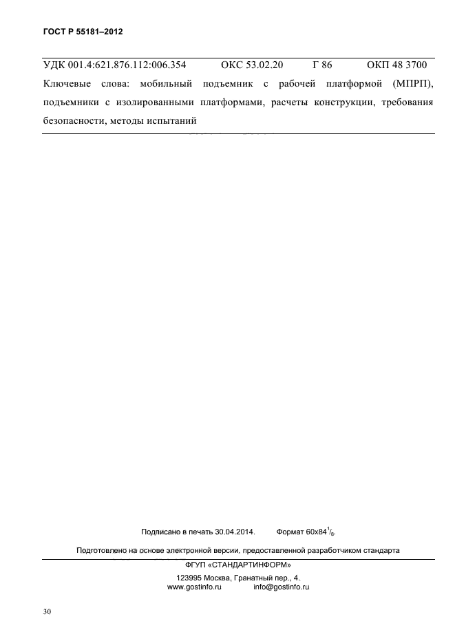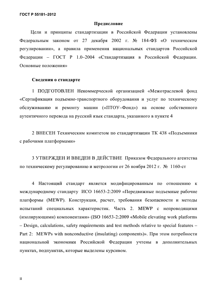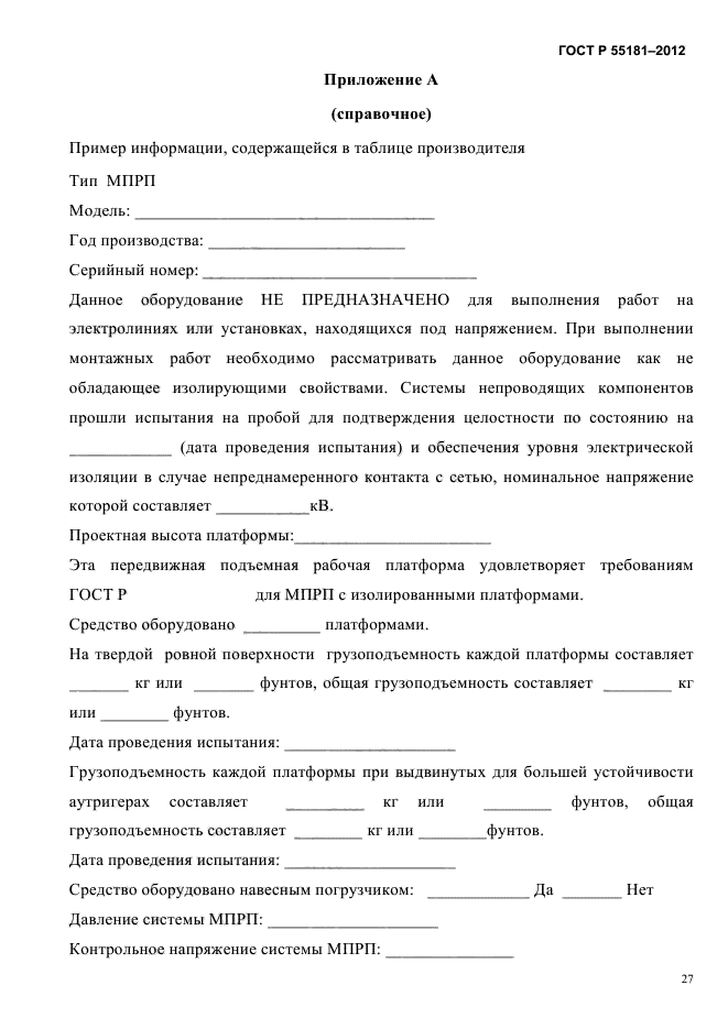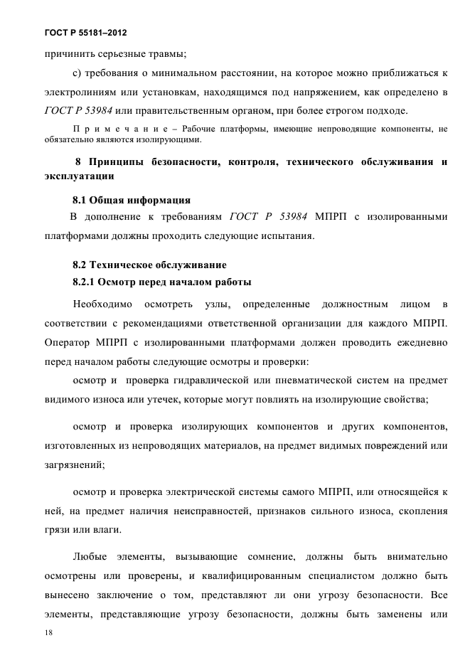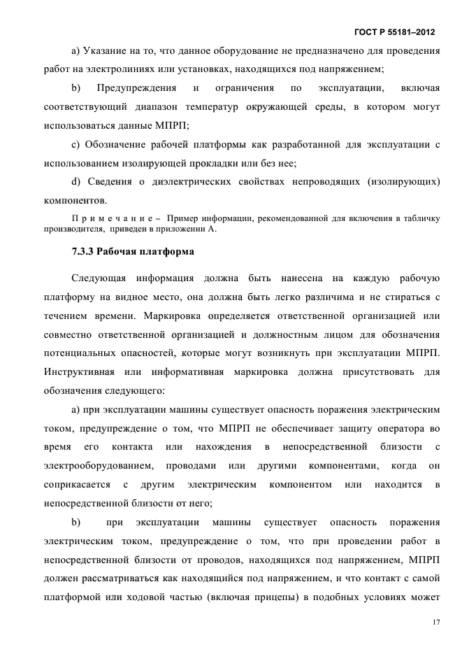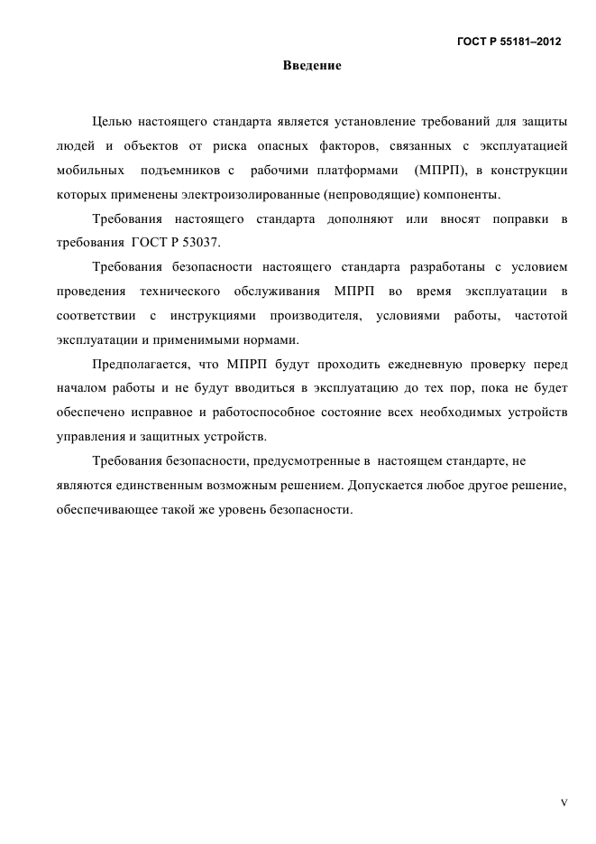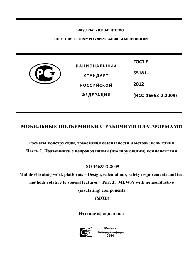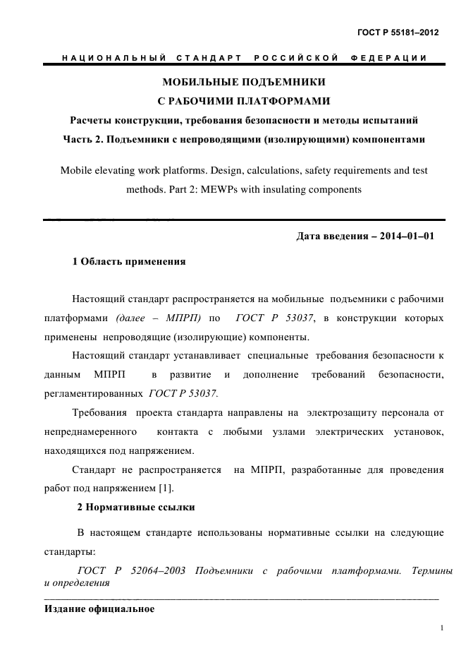 | Область и условия применения: | Настоящий стандарт распространяется на мобильные подъемники с рабочими платформами по ГОСТ Р 53037, в конструкции которых применены непроводящие (изолирующие) компоненты.