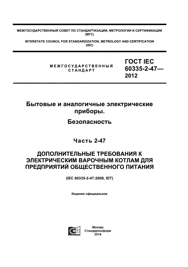 | Название рус.: | Бытовые и аналогичные электрические приборы. Безопасность. Часть 2-47. Дополнительные требования к электрическим варочным котлам для предприятий общественного питания |