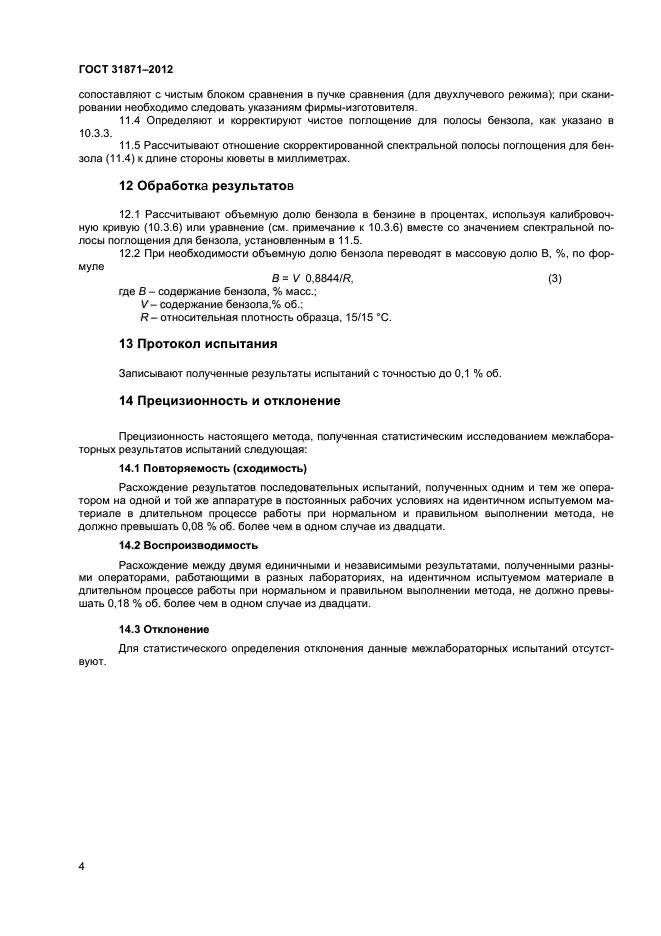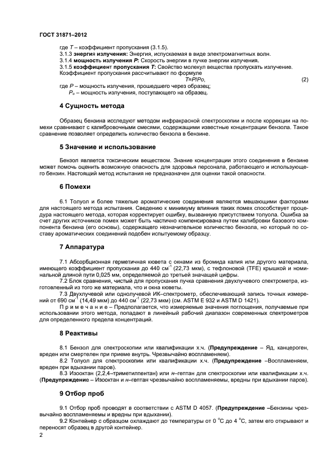 | Область и условия применения: | Настоящий стандарт устанавливает метод определения бензола от 0,1% об. до 5,0% об. в автомобильных и авиационных бензинах.