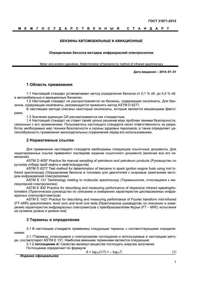 Настоящий стандарт устанавливает метод определения бензола от 0,1% об. до 5,0% об. в автомобильных и авиационных бензинах.