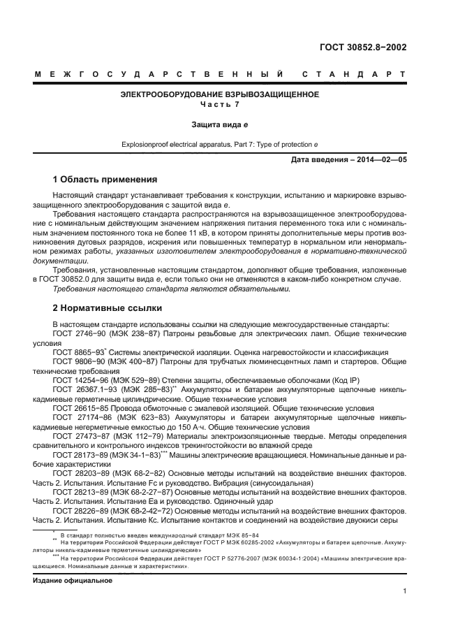 | Область и условия применения: | Настоящий стандарт устанавливает требования к конструкции, испытанию и маркировке взрывозащищенного электрооборудования с защитой вида e.
