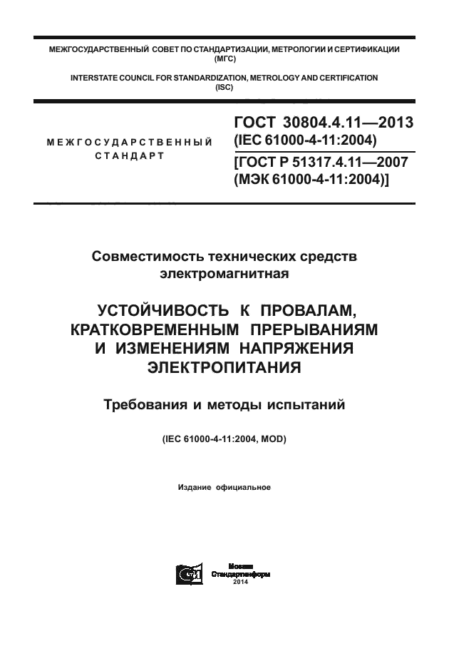 | Область и условия применения: | Настоящий стандарт устанавливает методы испытаний электротехнических, электронных и радиоэлектронных изделий и оборудования (далее - технические средства), подключаемых к низковольтным (напряжением не выше 1000 В) электрическим сетям переменного тока, на устойчивость к воздействию провалов, кратковременных прерываний и изменений напряжения электропитания, а также рекомендуемые уровни испытательных напряжений при проведении испытаний на помехоустойчивость (далее - уровни испытательных напряжений).