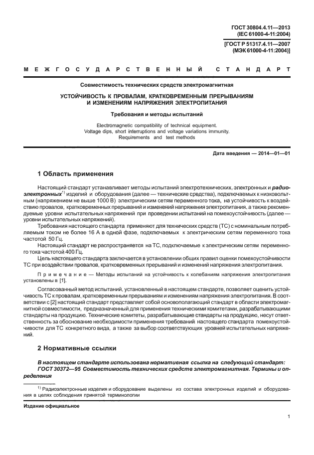 Настоящий стандарт устанавливает методы испытаний электротехнических, электронных и радиоэлектронных изделий и оборудования (далее - технические средства), подключаемых к низковольтным (напряжением не выше 1000 В) электрическим сетям переменного тока, на устойчивость к воздействию провалов, кратковременных прерываний и изменений напряжения электропитания, а также рекомендуемые уровни испытательных напряжений при проведении испытаний на помехоустойчивость (далее - уровни испытательных напряжений).