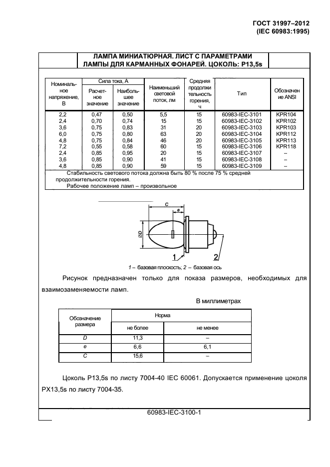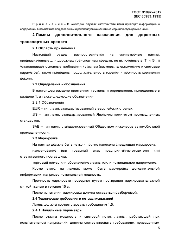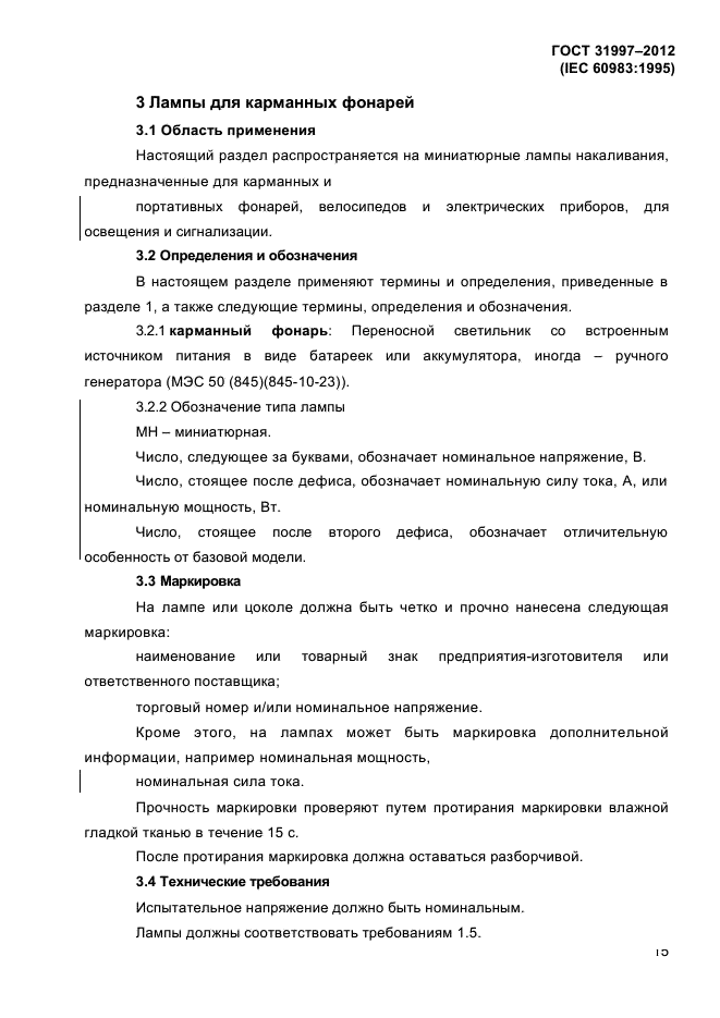 - лампы для дорожных транспортных средств (раздел 2), не предусмотренные [1] и не включенные в [3]; - лампы для электрических карманных фонарей (раздел 3); - лампы для рудничных головных светильников (раздел 4). Настоящий стандарт устанавливает требования к размерам, электрическим и световым параметрам, а также к продолжительности горения и механической прочности ламп |