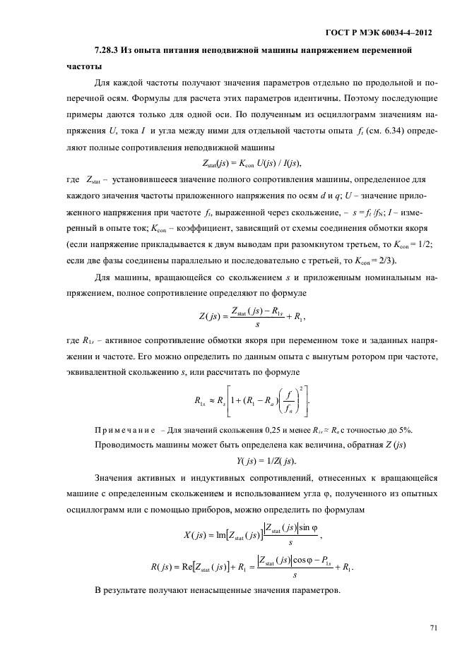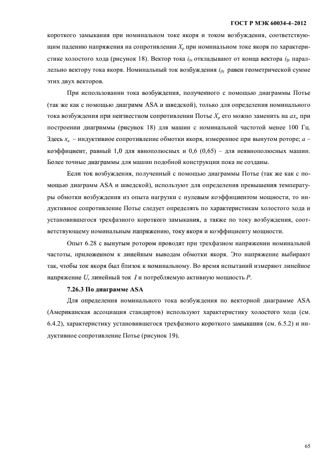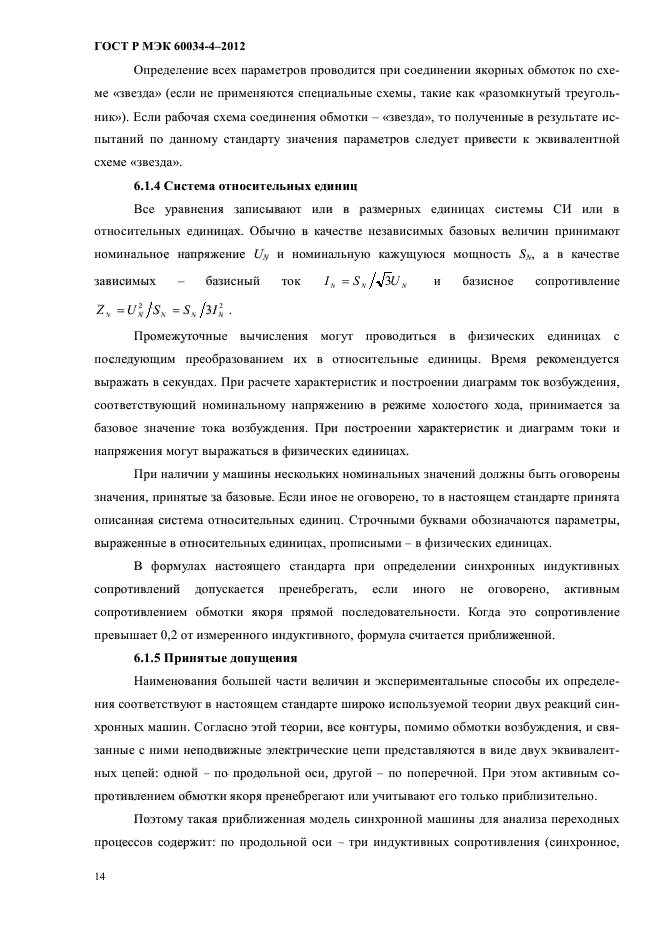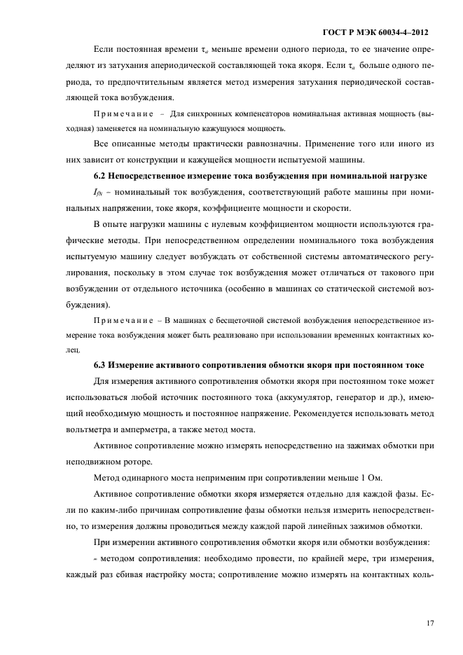| Область и условия применения: | Объектом стандартизации являются экспериментальные методы определения параметров трехфазных синхронных машин мощностью 1 кВт и выше с номинальной частотой от 10 до 500 Гц. Большая часть методов предназначена для машин, имеющих обмотку возбуждения, контактные кольца и щетки. Синхронные машины с бесконтактным возбуждением требуют специальных условий для проведения отдельных опытов. Синхронные машины с возбуждением от постоянных магнитов имеют ограничения по применению описанных методов и принятия мер предосторожности для избежания их размагничивания.