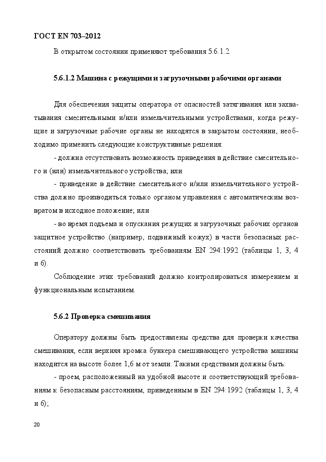 Настоящий стандарт распространяется только на машины, имеющие следующие комбинации рабочих функций: - смешивание и распределение; или - смешивание, измельчение и распределение; или - загрузка, смешивание и распределение; или - загрузка, смешивание, измельчение и распределение; или - измельчение и распределение; или - загрузка, измельчение и распределение. Оборудование для разрезания силоса на блоки, даже если оно выполняет только одну функцию, включено в настоящий стандарт. Стандарт не распространяется на: - машины для уборки зеленой массы непосредственно в поле; - грузоподъемные краны; - ковши для силоса. Настоящий стандарт рассматривает все существенные опасности, опасные ситуации и события в отношении машин для загрузки, смешивания и (или) измельчения и распределения силоса и (или) других кормов при их использовании по назначению в условиях, предусмотренных изготовителем и перечисленных в разделе 4, кроме опасностей, возникающих при: - отказе цепи управления; - ненадлежащем сидении; - ненадлежащем освещении; - невозможности останова машины в наиболее благоприятных условиях; - перемещении машины; - разрушении частей, вращающихся с высокой частотой. Настоящий стандарт не рассматривает опасности воздействия на окружающую среду (кроме воздействия шума). Настоящий стандарт не распространяется на машины для загрузки, смешивания и (или) измельчения и распределения силоса и/или других кормов, технические задания на которые утверждены до даты введения настоящего стандарта |