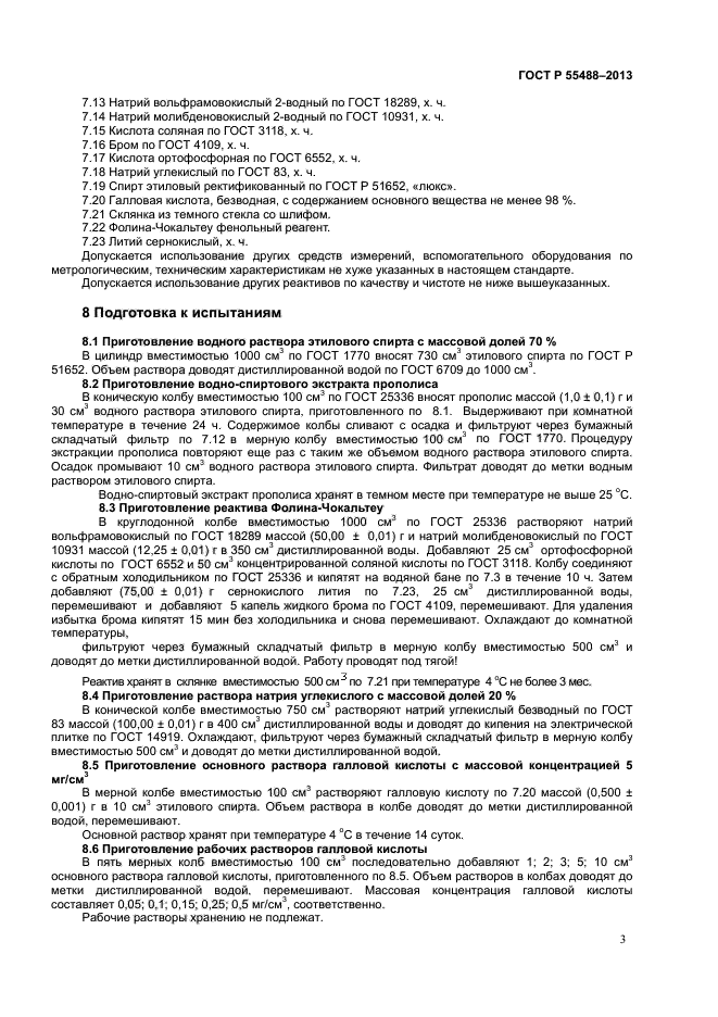 Настоящий стандарт распространяется на прополис и устанавливает метод определения суммарного содержания полифенольных соединений водно-спиртового экстракта прополиса модифицированным методом Фолина-Чокальтеу в пересчете на галловую кислоту