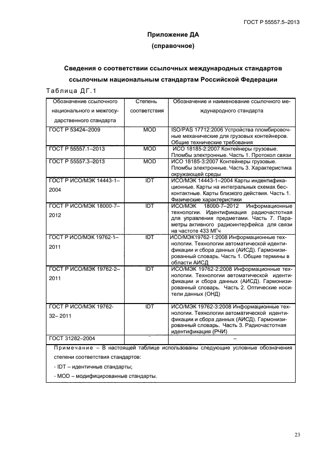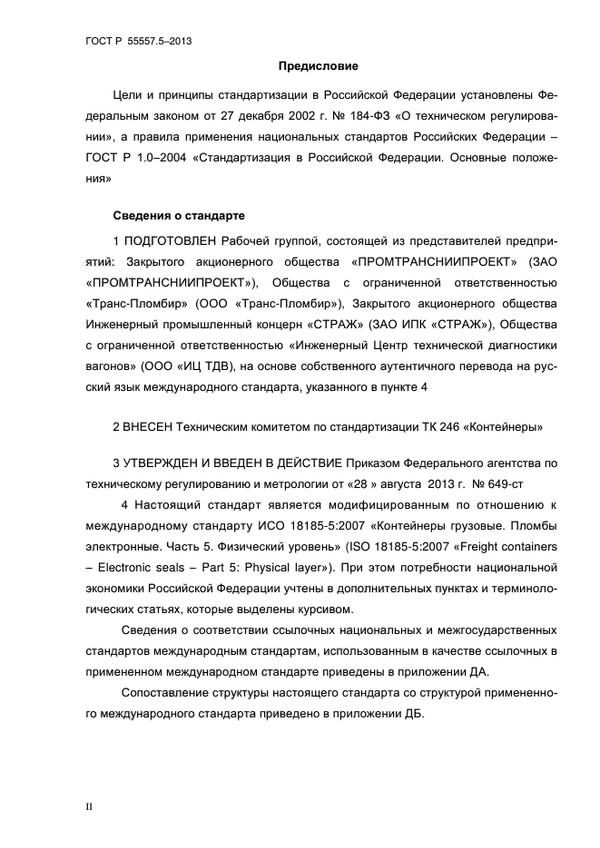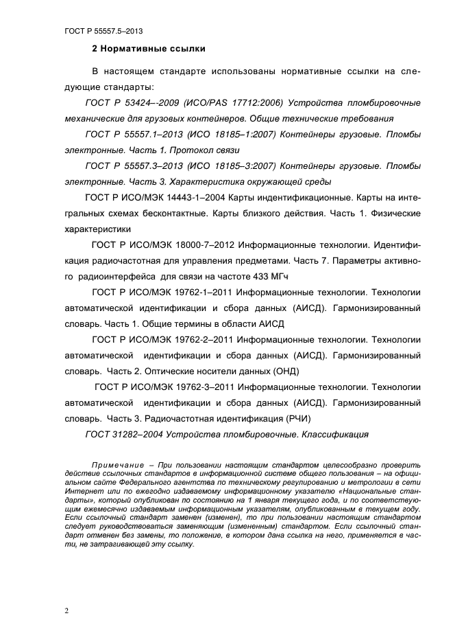 | Область и условия применения: | Настоящий стандарт устанавливает требования к системе идентификации и представлению информации об электронных пломбах грузовых контейнеров. Система идентификации обеспечивает однозначную и уникальную идентификацию контейнерной пломбы, ее состояния и сопутствующую информацию.