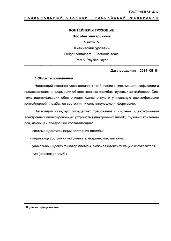 Настоящий стандарт устанавливает требования к системе идентификации и представлению информации об электронных пломбах грузовых контейнеров. Система идентификации обеспечивает однозначную и уникальную идентификацию контейнерной пломбы, ее состояния и сопутствующую информацию.