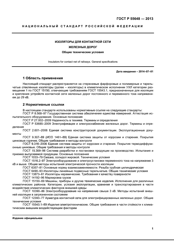 Настоящий стандарт распространяется на стержневые фарфоровые и полимерные и тарельчатые стеклянные изоляторы в климатическом исполнении УХЛ категории размещения 1 по ГОСТ 15150, отвечающие требованиям ГОСТ 15543.1, предназначенные для изоляции и крепления устройств контактной сети железных дорог постоянного и переменного тока напряжением до 29 кВ