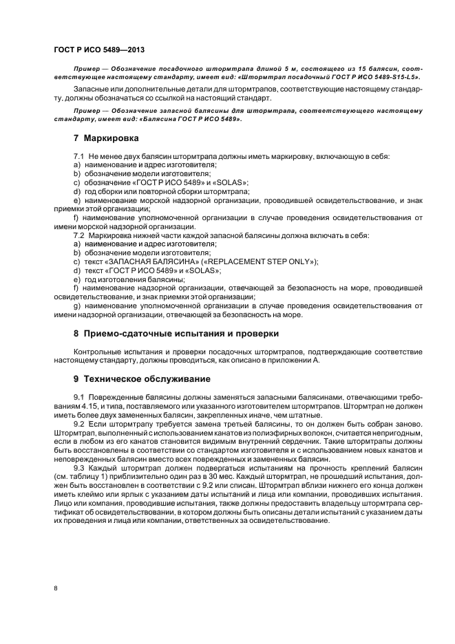 | Область и условия применения: | Настоящий стандарт устанавливает требования для судовых посадочных штормтрапов, которые обеспечивают безопасную посадку вдоль надводной части корпуса судна в коллективное спасательное средство после спуска его на воду. Посадочные штормтрапы применяют на судах, которые должны иметь посадочные штормтрапы согласно Главе III Международной Конвенции по охране человеческой жизни на море (СОЛАС-1974), с поправками. Национальные администрации по обеспечению безопасности на море должны контролировать, чтобы суда имели на борту штормтрапы, соответствующие настоящему стандарту и полностью отвечающие требованиям Конвенции СОЛАС-74 |