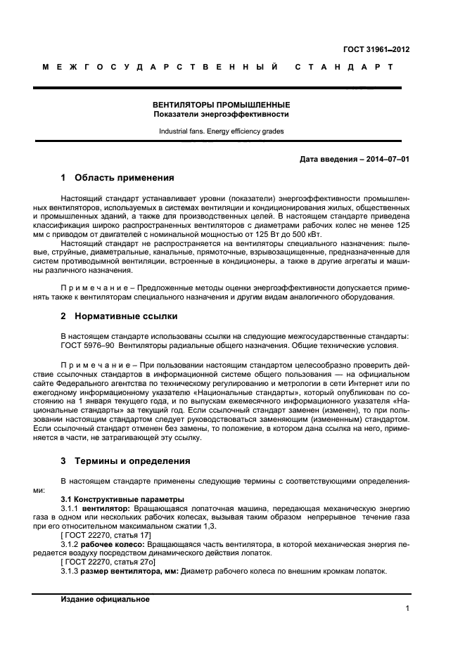 Настоящий стандарт устанавливает уровни (показатели) энергоэффективности промышленных вентиляторов, используемых в системах вентиляции и кондиционирования жилых, общественных и промышленных зданий, а также для производственных целей. В настоящем стандарте приведена классификация широко распространенных вентиляторов с диаметрами рабочих колес не менее 125 мм с приводом от двигателей c номинальной мощностью от 125 Вт до 500 кВт.