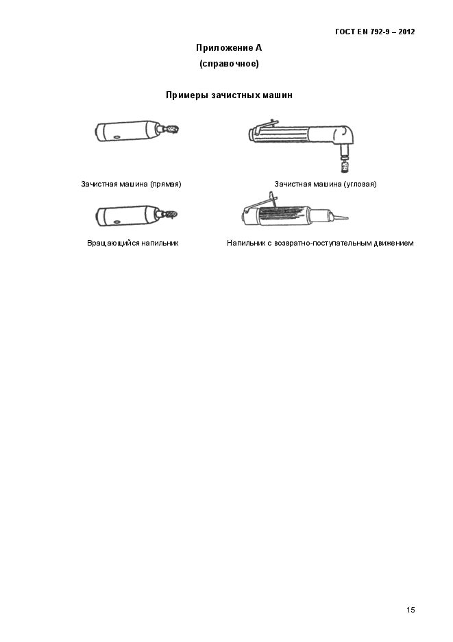 | Область и условия применения: | Настоящий стандарт распространяется на ручные неэлектрические машины с приводом от двигателей вращательного или возвратно-поступательного движения, работающих на сжатом воздухе или рабочей жидкости, удерживаемые при эксплуатации оператором при помощи: