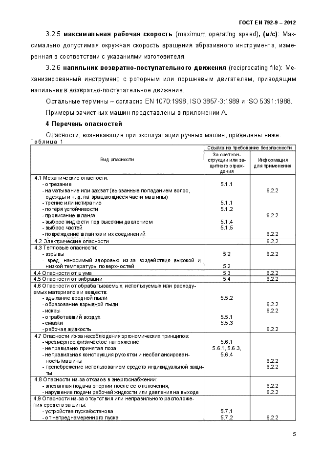 - одной руки или обеих рук; - подвесного устройства. Настоящий стандарт распространяется на ручные неэлектрические машины, оснащенные зажимными втулками, применяемые для зачистки с использованием установленных наконечников (резцов), точильных камней и напильников (надфилей), а также малых проволочных щеток, устанавливаемых на шпинделе. В настоящем стандарте перечислены опасности, возникающие в процессе работы машин, и указаны требования безопасности, которым они должны соответствовать во время установленного срока службы. К зачистным машинам относятся: - угловые шлифовальные (зачистные) машины; - напильники возвратно-поступательного движения; - вращающиеся напильники; - прямые зачистные машины. Настоящий стандарт не распространяется на специальные и модифицированные ручные машины, устанавливаемые в приспособлениях |