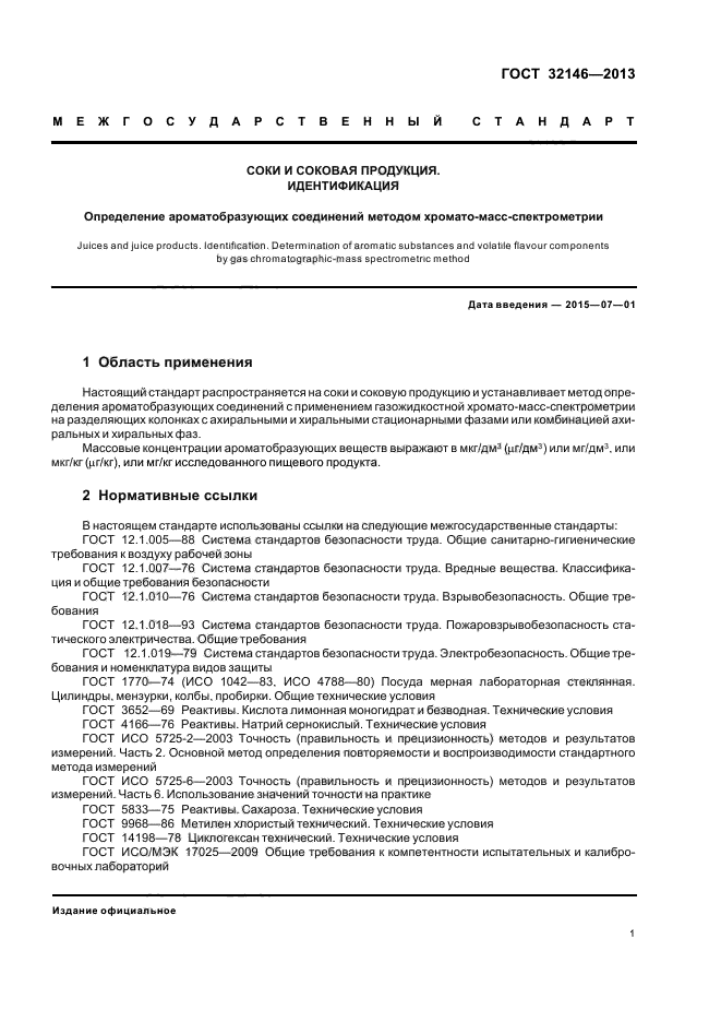 | Название рус.: | Соки и соковая продукция. Идентификация. Определение ароматобразующих соединений методом хромато-масс-спектрометрии |