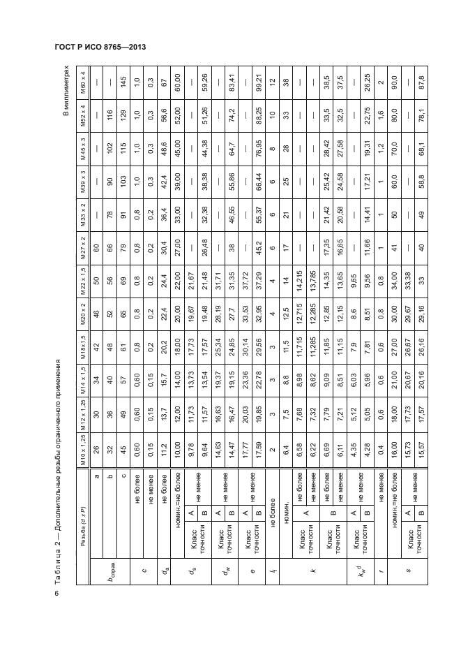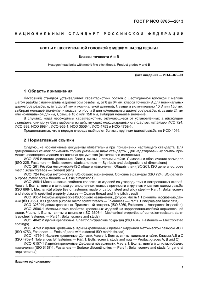 Настоящий стандарт устанавливает характеристики болтов с шестигранной головкой с мелким шагом резьбы с номинальным диаметром резьбы, d, от 8 до 64 мм, класса точности А для номинальных диаметров резьбы, d, от 8 до 24 мм и номинальной длинной, l, выше и включительно 10 d или 150 мм, выбирая меньшее значение, и класса точности В для номинальных диаметров резьбы, d, свыше 24 мм или номинальной длины, l, свыше 10 d или 150 мм, выбирая меньшее значение