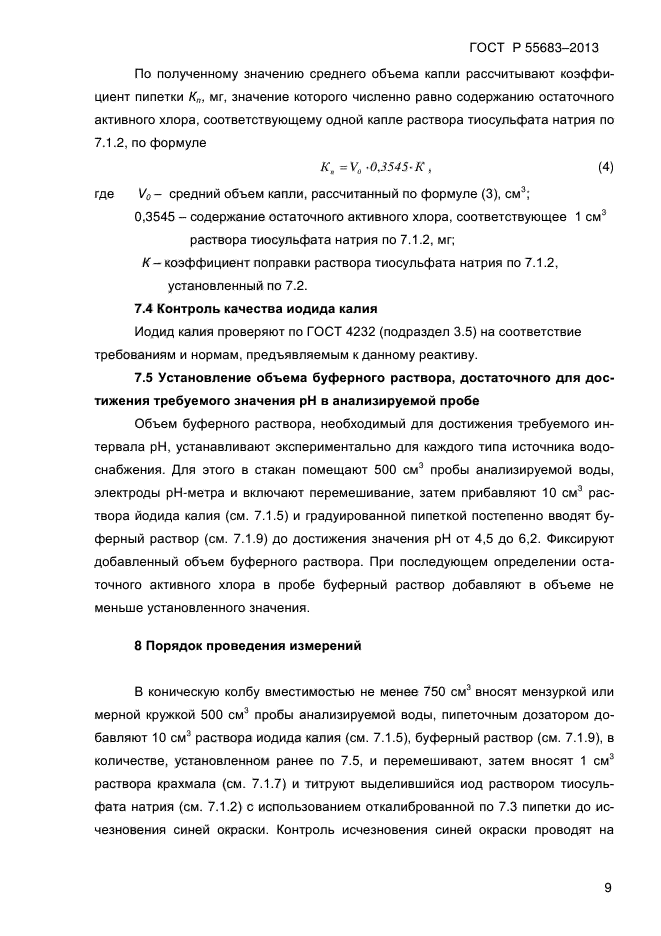 Настоящий стандарт распространяется на питьевую воду (в том числе воду бассейнов) и устанавливает титриметрический метод определения массовой концентрации остаточного активного (общего) хлора от 0,15 до 2,0 мг/дм куб. на месте отбора проб
