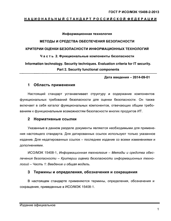 | Область и условия применения: | Настоящий стандарт устанавливает структуру и содержание компонентов функциональных требований безопасности для оценки безопасности. Он также включает в себя каталог функциональных компонентов, отвечающих общим требованиям к функциональным возможностям безопасности многих продуктов ИТ |