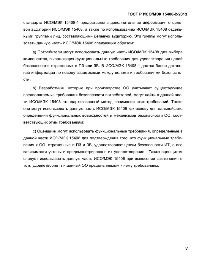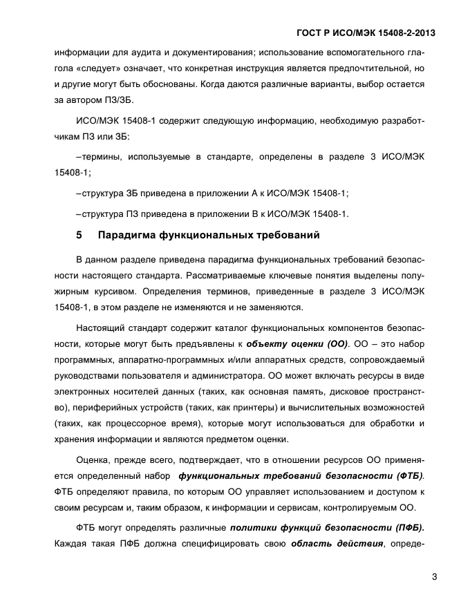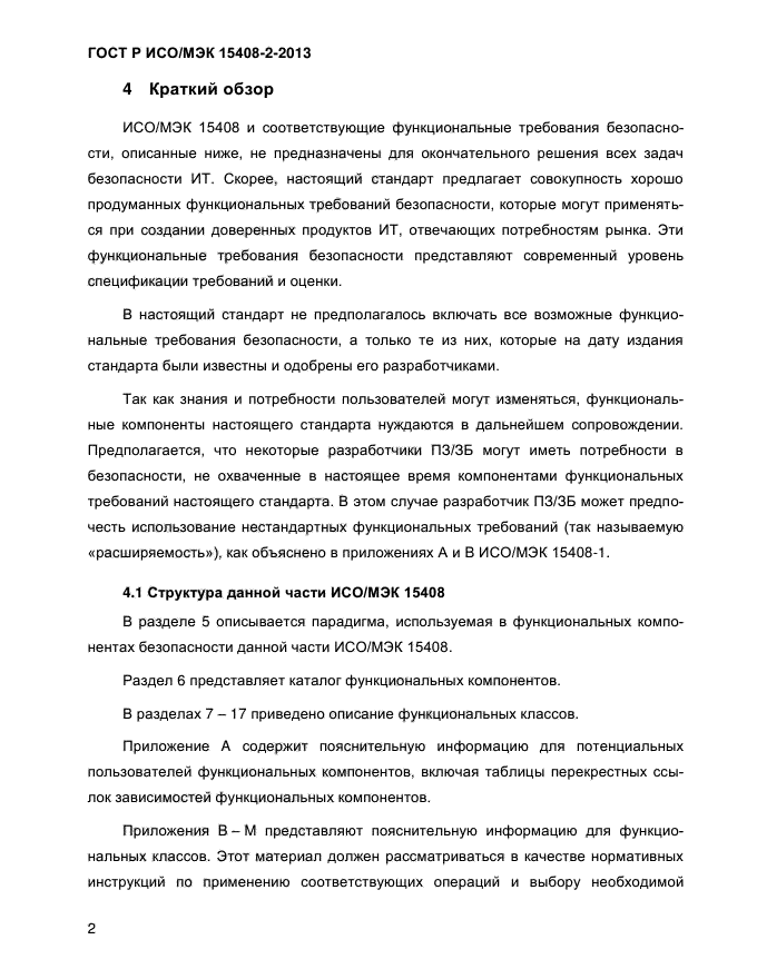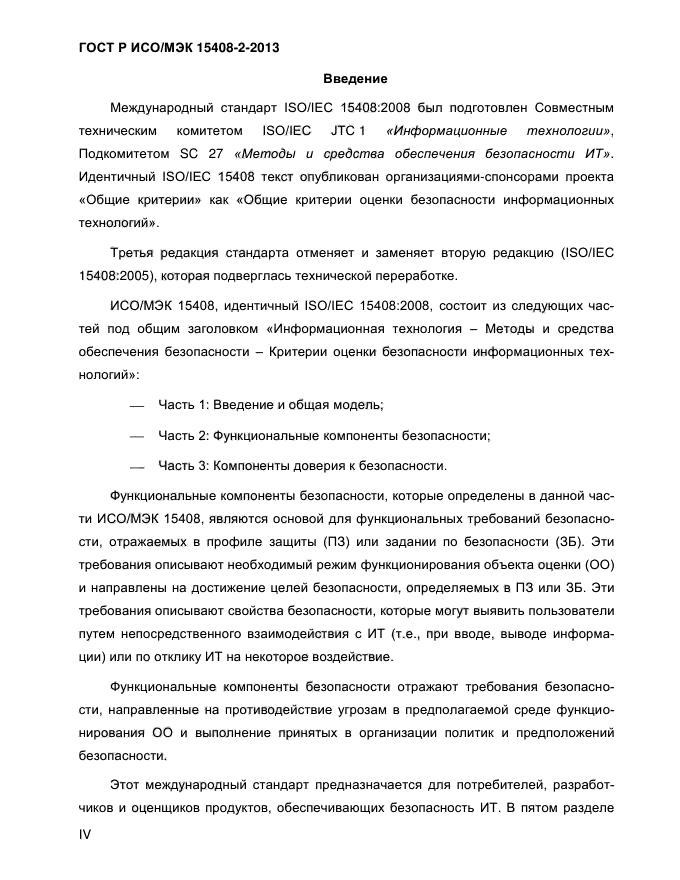 Настоящий стандарт устанавливает структуру и содержание компонентов функциональных требований безопасности для оценки безопасности. Он также включает в себя каталог функциональных компонентов, отвечающих общим требованиям к функциональным возможностям безопасности многих продуктов ИТ
