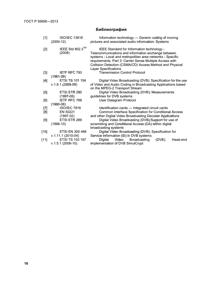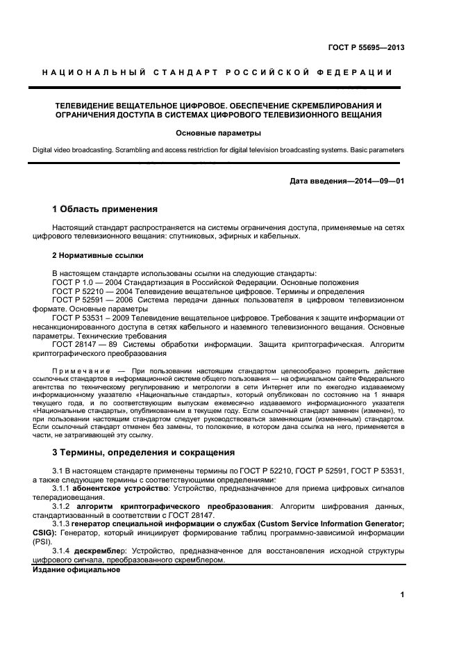 | Область и условия применения: | Настоящий стандарт распространяется на системы ограничения доступа, применяемые на сетях цифрового телевизионного вещания: спутниковых, эфирных и кабельных |