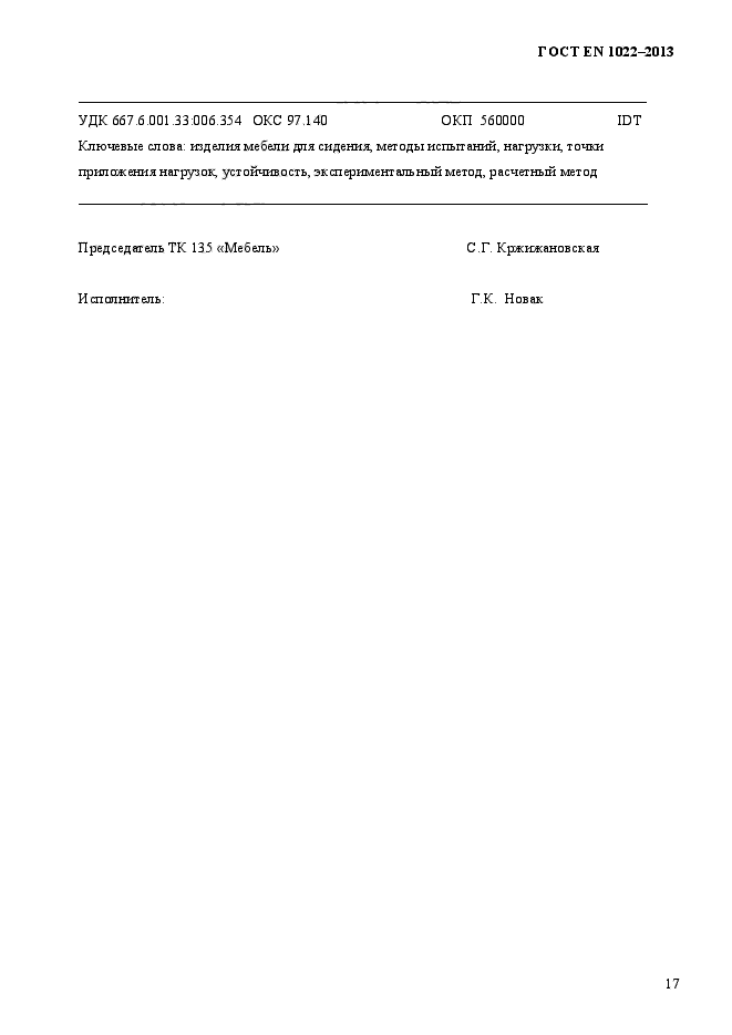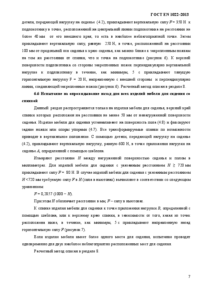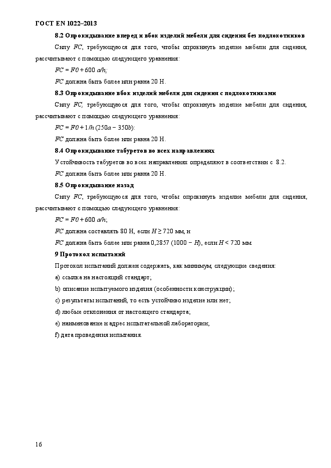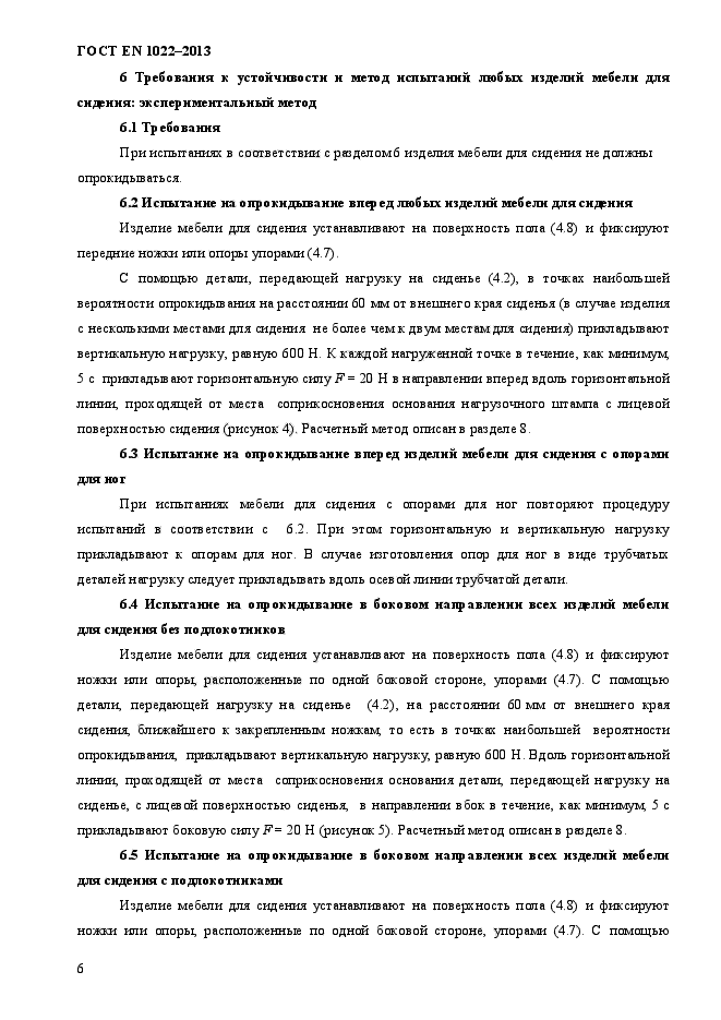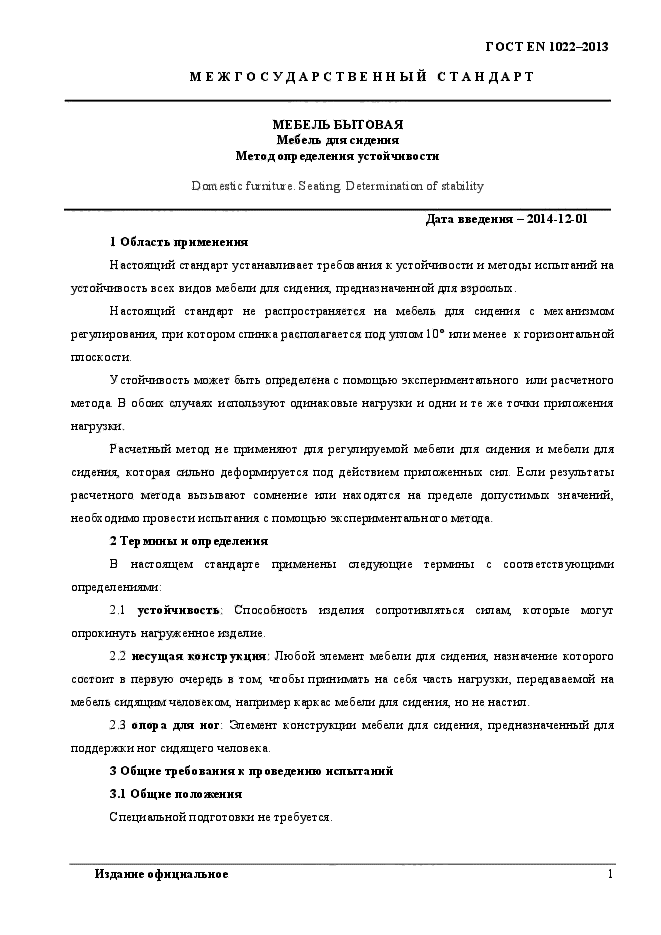 | Область и условия применения: | Настоящий стандарт устанавливает требования к устойчивости и методы испытаний на устойчивость всех видов мебели для сидения, предназначенной для взрослых и используемой в жилых помещениях.