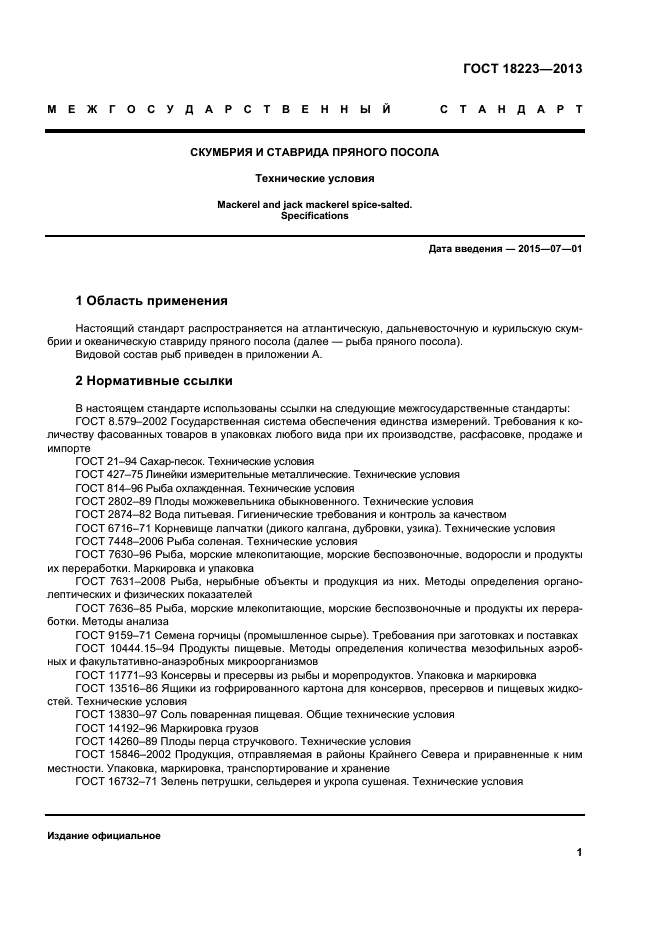 | Область и условия применения: | Настоящий стандарт распространяется на атлантическую, дальневосточную и курильскую скумбрии и океаническую ставриду пряного посола |