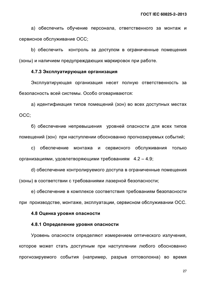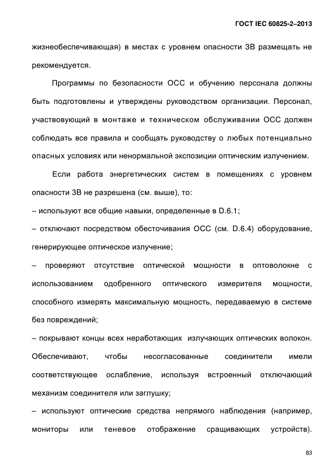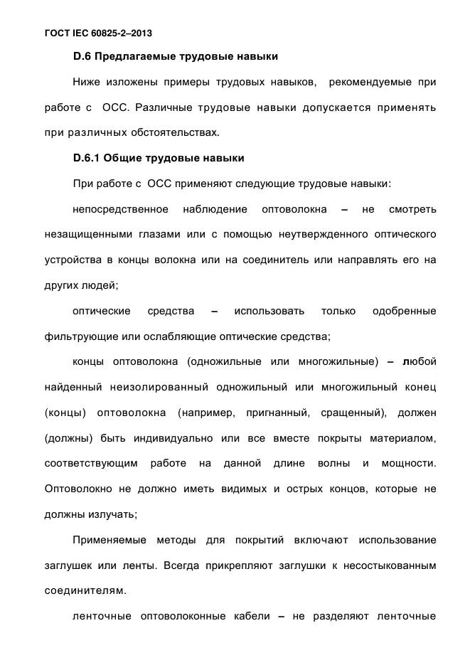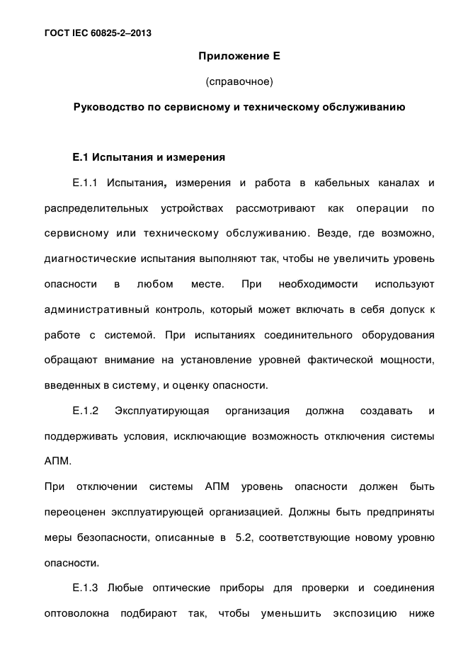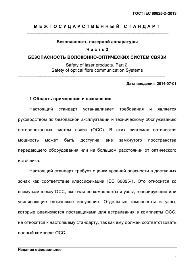 | Область и условия применения: | Настоящий стандарт устанавливает требования и является руководством по безопасной эксплуатации и техническому обслуживанию оптоволоконных систем связи (ОСС) |
