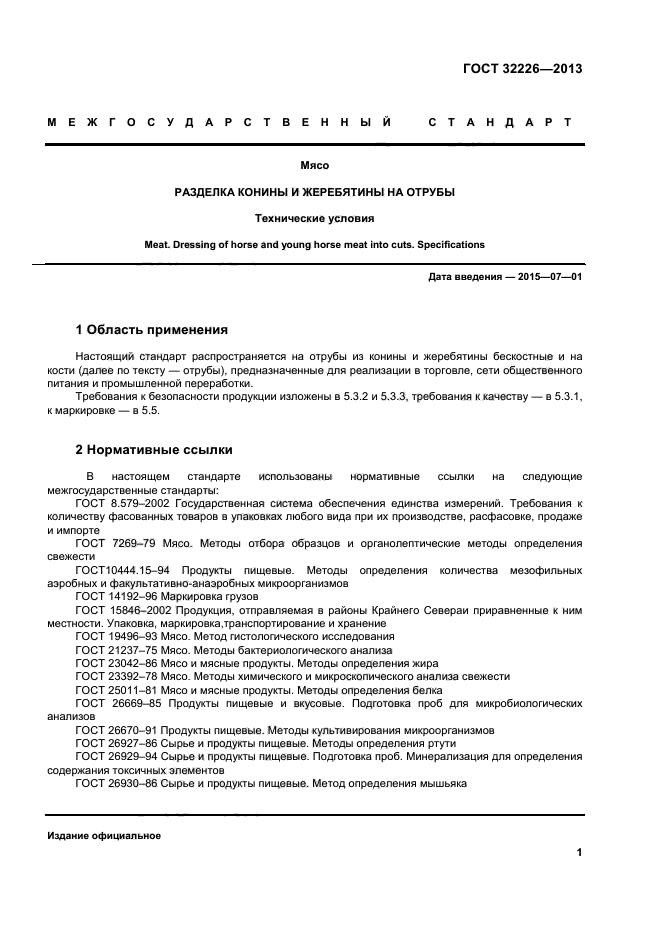 | Область и условия применения: | Настоящий стандарт распространяется на отрубы из конины и жеребятины бескостные и на кости, предназначенные для реализации в торговле, сети общественного питания и промышленной переработки |