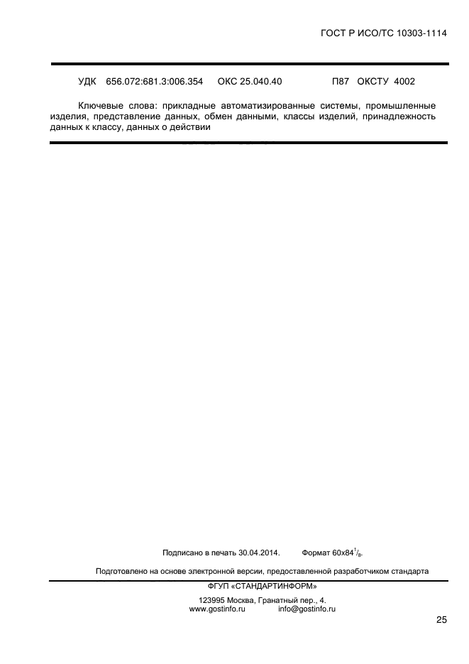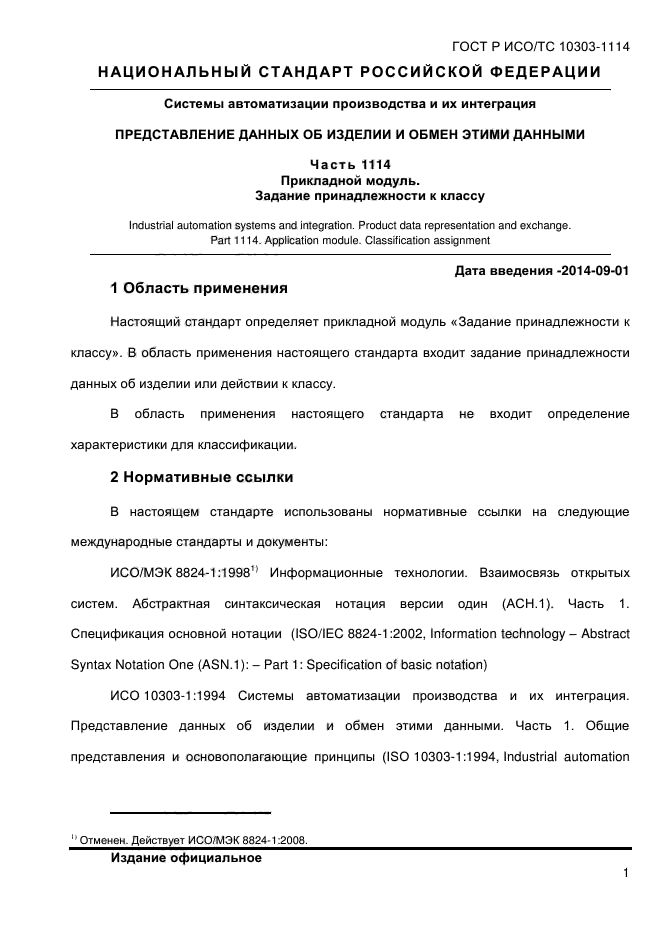 | Название рус.: | Системы автоматизации производства и их интеграция. Представление данных об изделии и обмен этими данными. Часть 1114. Прикладной модуль. Задание принадлежности к классу |