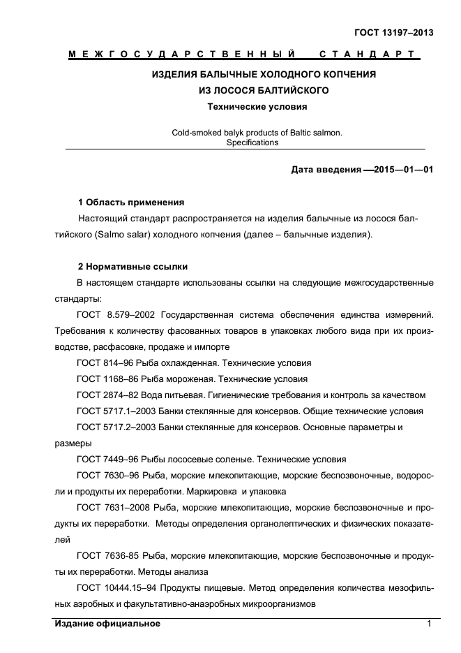 Настоящий стандарт распространяется на изделия балычные из лосося балтийского (Salmo salar) холодного копчения
