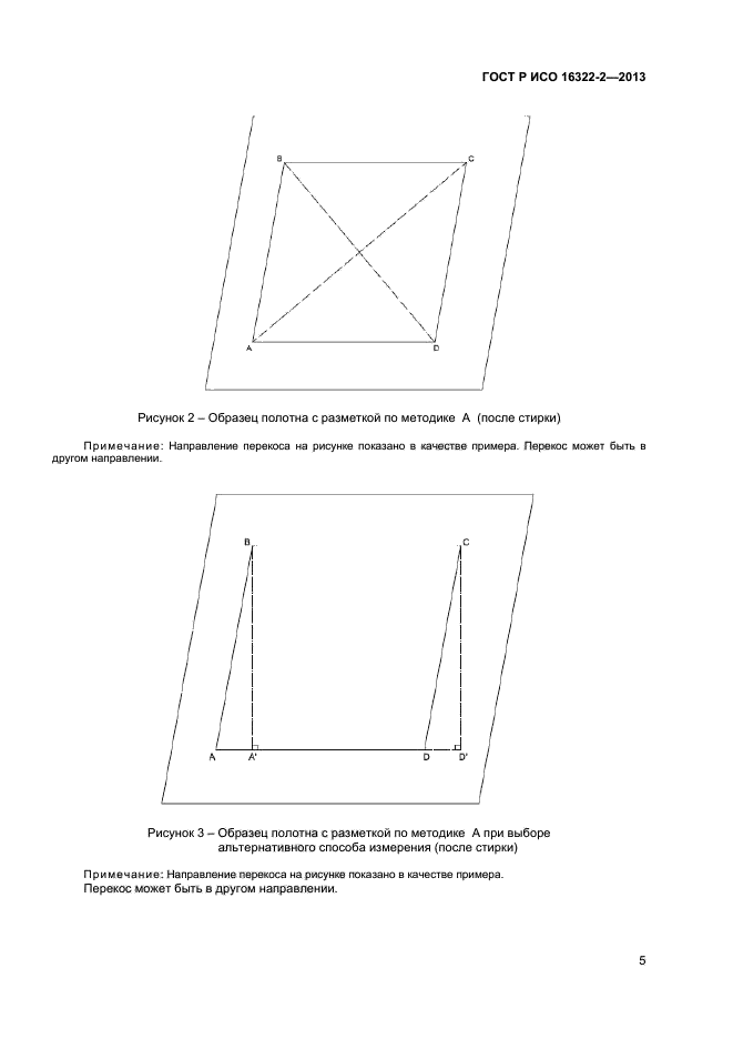 Результаты, полученные по различным методикам, сравнению не подлежат. Эта часть ГОСТ Р ИСО 16322 не предназначена для измерения перекоса готовых полотен, а применима лишь к оценке перекоса после стирки |
