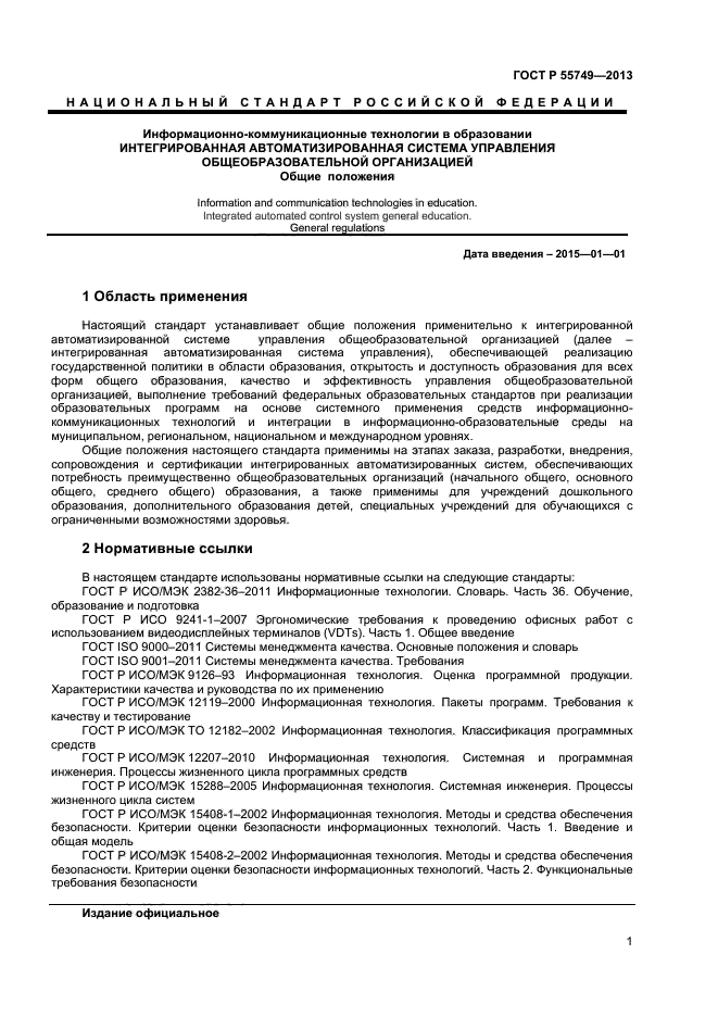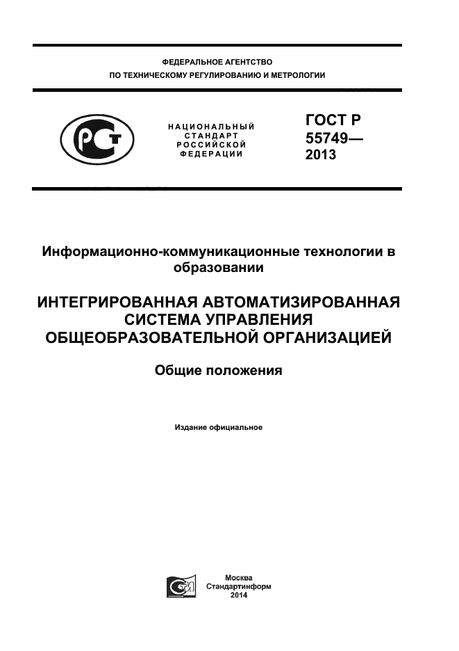 Настоящий стандарт устанавливает общие положения применительно к интегрированной автоматизированной системе управления общеобразовательной организацией, обеспечивающей реализацию государственной политики в области образования, открытость и доступность образования для всех форм общего образования, качество и эффективность управления общеобразовательной организацией, выполнение требований федеральных образовательных стандартов при реализации образовательных программ на основе системного применения средств информационно-коммуникационных технологий и интеграции в информационно-образовательные среды на муниципальном, региональном, национальном и международном уровнях