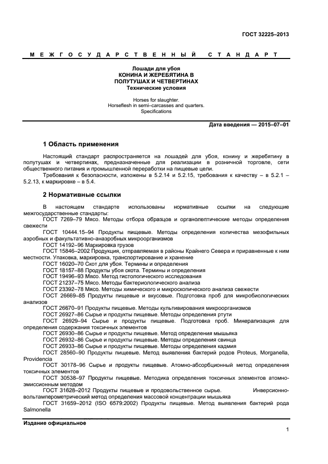 Настоящий стандарт распространяется на лошадей для убоя, конину и жеребятину в полутушах и четвертинах, предназначенные для реализации в розничной торговле, сети общественного питания и промышленной переработки на пищевые цели