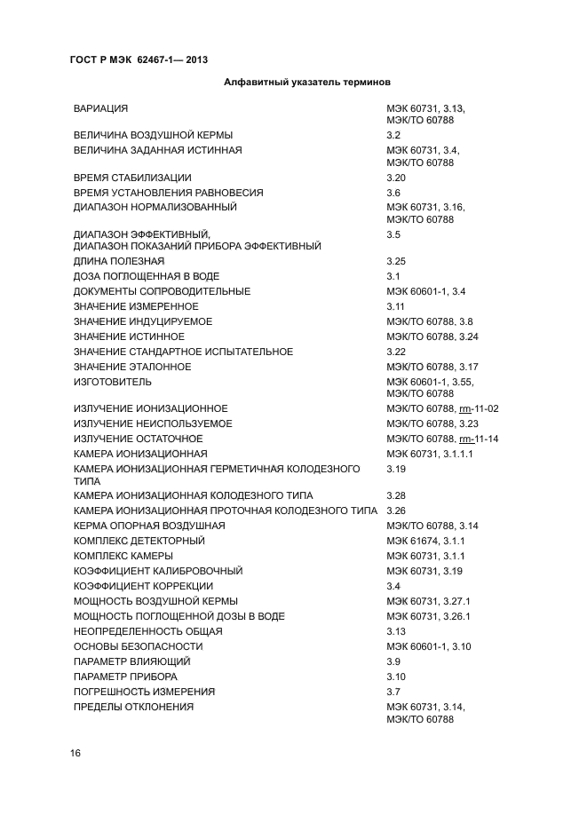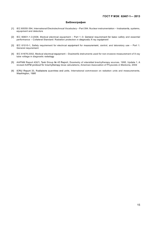 | Область и условия применения: | Настоящий стандарт определяет характеристики и некоторые взаимосвязанные конструктивные требования к ионизационным камерам колодезного типа и присоединенной измерительной аппаратуры, определенной в классе 3, предназначенной для определения величины воздушной кермы или опорной воздушной кермы в полях фотонного излучения или поглощенной дозы в воде на глубине в полях фотонного и бета-излучений, используемых в брахитерапии после соответствующей калибровки для источника излучения данного типа.