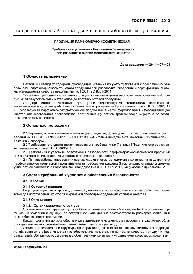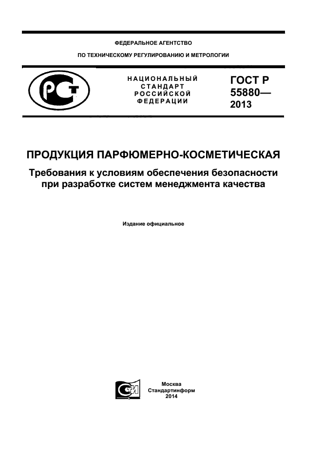 | Область и условия применения: | Настоящий стандарт содержит руководящие указания по учету требований к обеспечению безопасности парфюмерно-косметической продукции при разработке, внедрении и сертификации системы менеджмента качества предприятия по ГОСТ ISO 9001-2011.