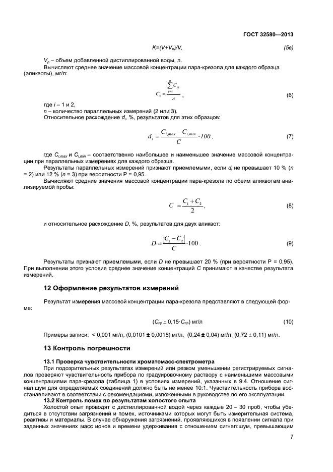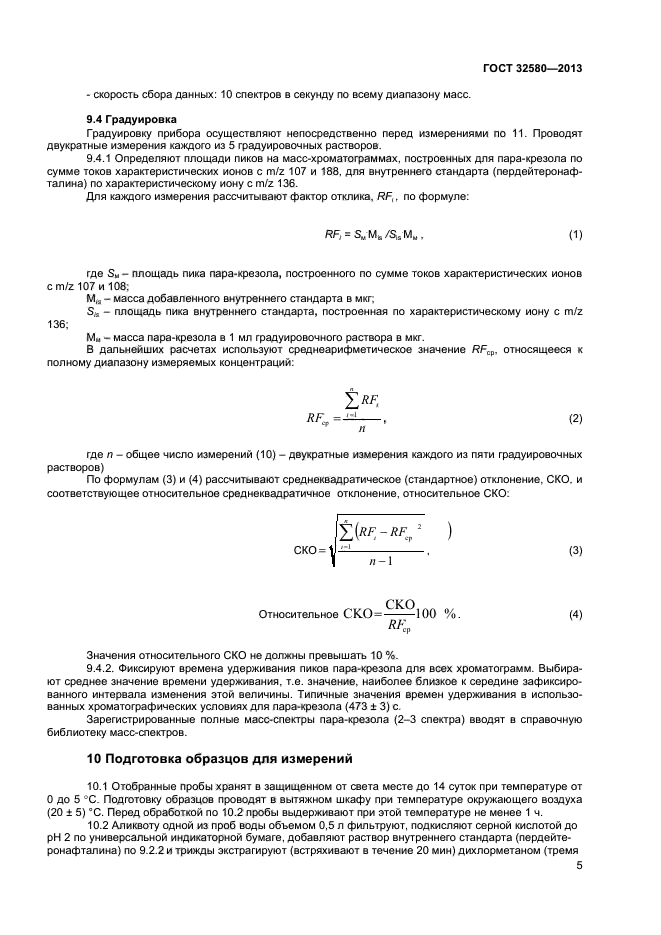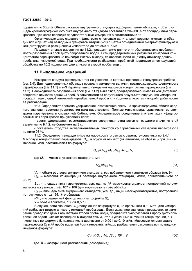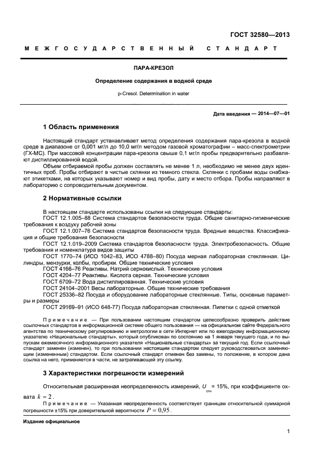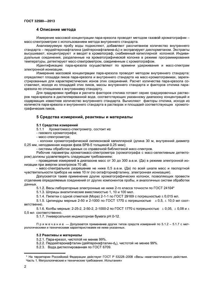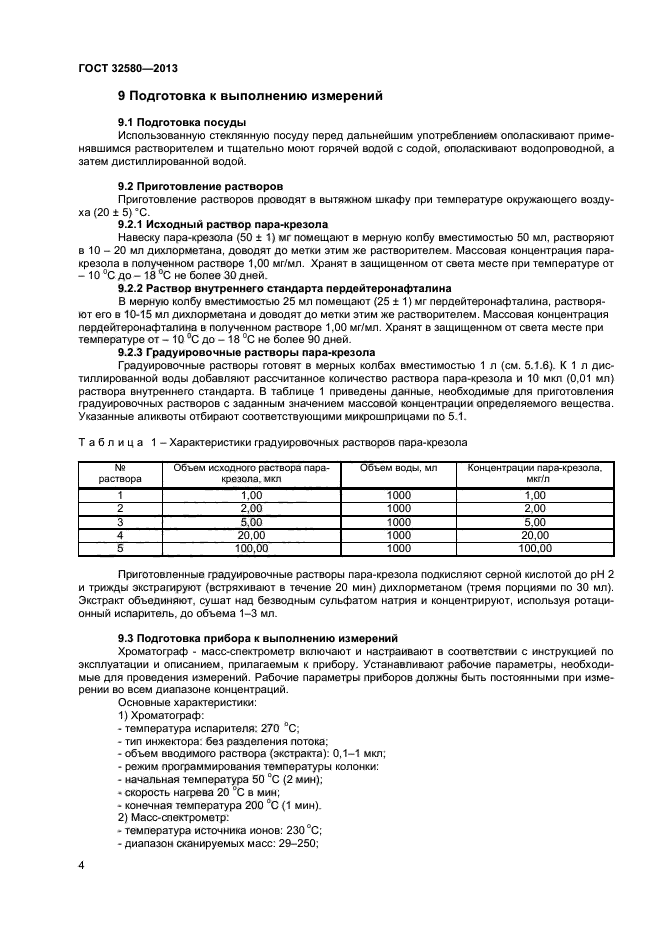 Настоящий стандарт устанавливает метод определения содержания паракрезола в водной среде в диапазоне от 0.001 мг/л до 10,0 мг/л методом газовой хромаграфии - масс-спектрометрии (ГХ-МС). При массовой концентрации пара-крезола свыше 0,1 мг/л пробы предварительно разбавляют дистиллированной водой.