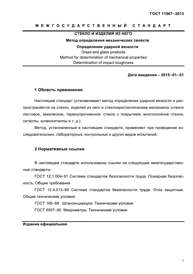 Настоящий стандарт устанавливает метод определения ударной вязкости и распространяется на стекло, изделия из него и стеклокристаллические материалы (стекло листовое, закаленное, термоупрочненное, стекло с покрытием, многослойное стекло, ситаллы, шлакоситаллы и т. д.).