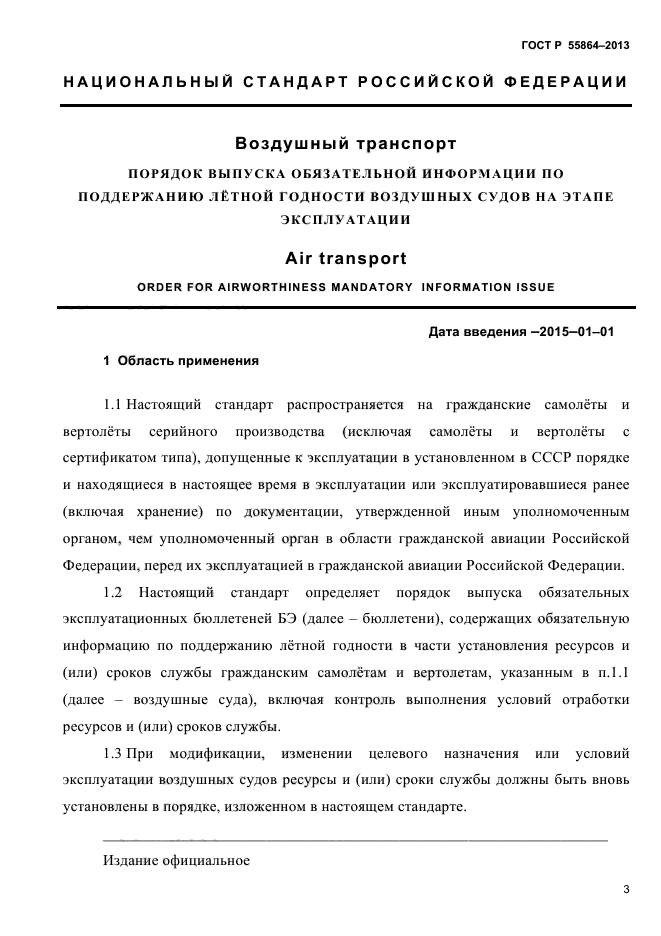 Настоящий стандарт определяет порядок выпуска обязательных эксплуатационных бюллетеней БЭ, содержащих обязательную информацию по поддержанию лётной годности в части установления ресурсов и (или) сроков службы гражданским самолётам и вертолетам, указанным в п.1.1 (далее – воздушные суда), включая контроль выполнения условий отработки ресурсов и (или) сроков службы.