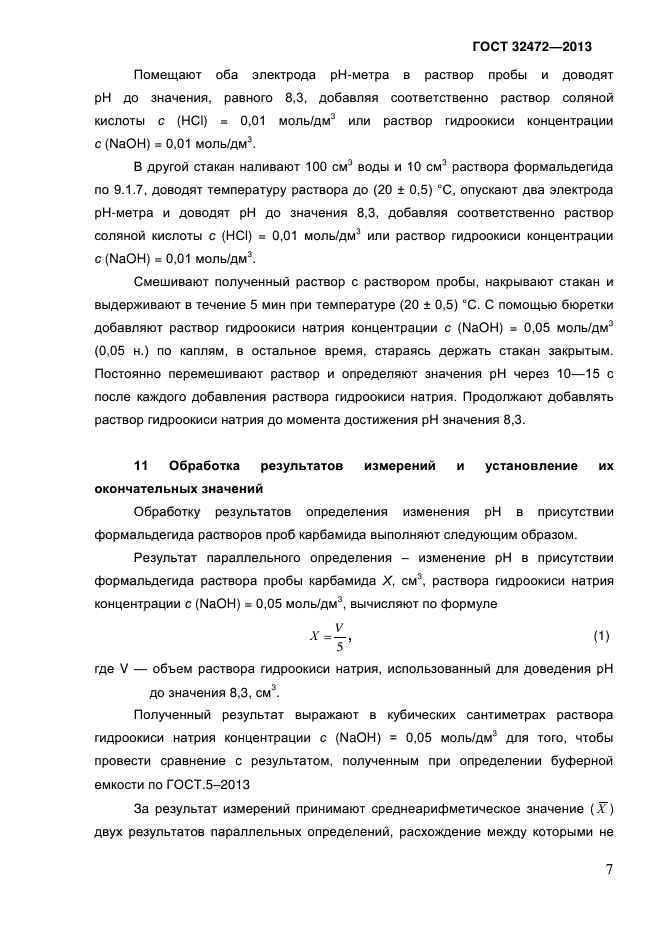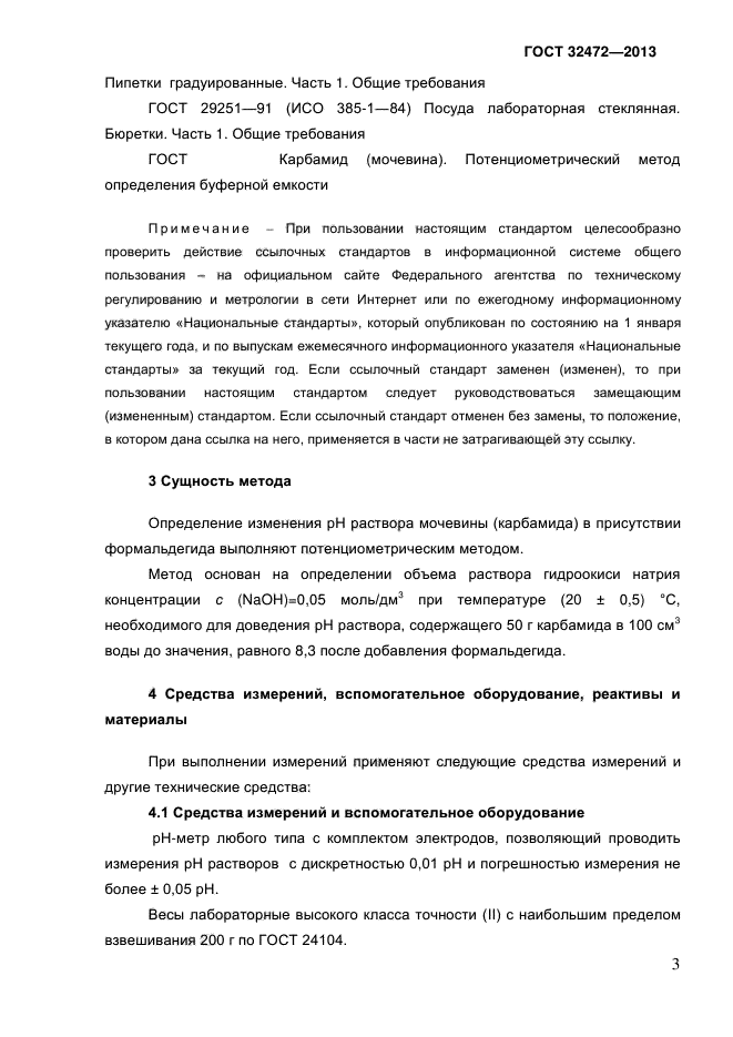 Настоящий стандарт устанавливает порядок определения изменения рН раствора карбамида в присутствии формальдегида при добавлении раствора гидроокиси натрия концентрации с (NaOH) = 0,05 моль/дм куб. в диапазоне от 1,30 до 3,50 см куб. потенциометрическим методом