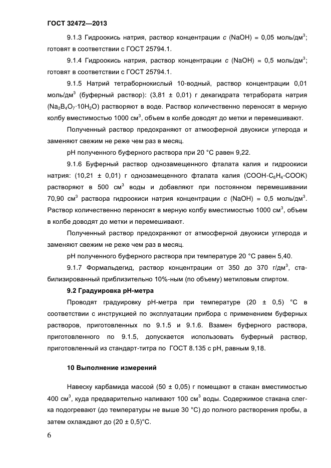 | Область и условия применения: | Настоящий стандарт устанавливает порядок определения изменения рН раствора карбамида в присутствии формальдегида при добавлении раствора гидроокиси натрия концентрации с (NaOH) = 0,05 моль/дм куб. в диапазоне от 1,30 до 3,50 см куб. потенциометрическим методом |