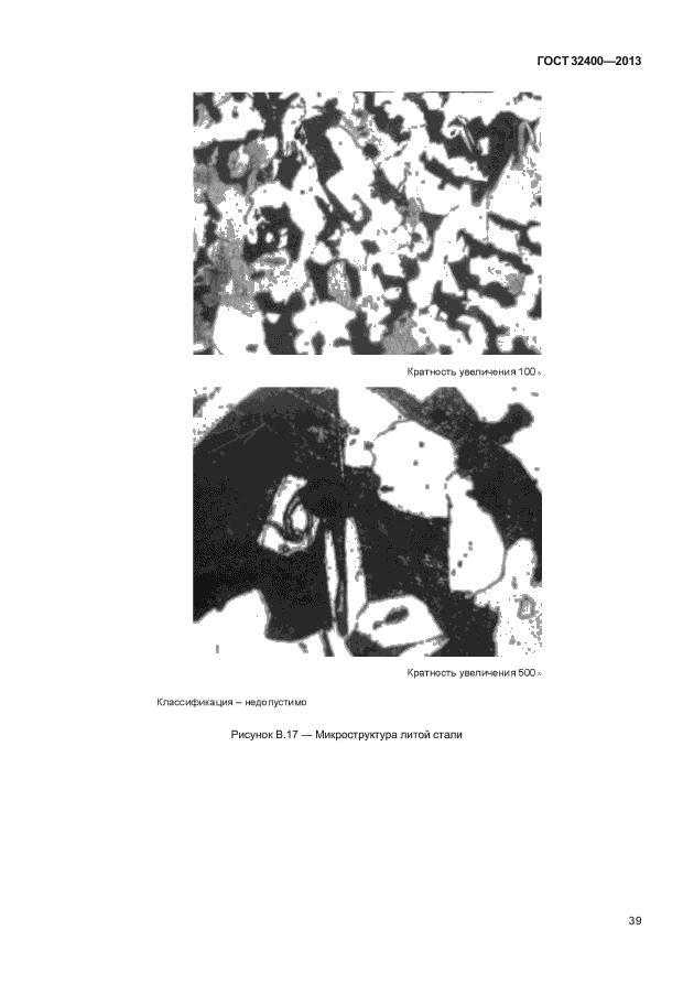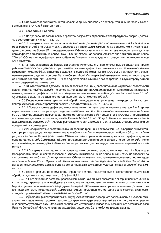 | Область и условия применения: | Настоящий стандарт распространяется на стальные литые боковые рамы и надрессорные балки двухосных трехэлементных тележек грузовых вагонов железных дорог колеи 1520 мм, требования к которым установлены в ГОСТ 9246 |