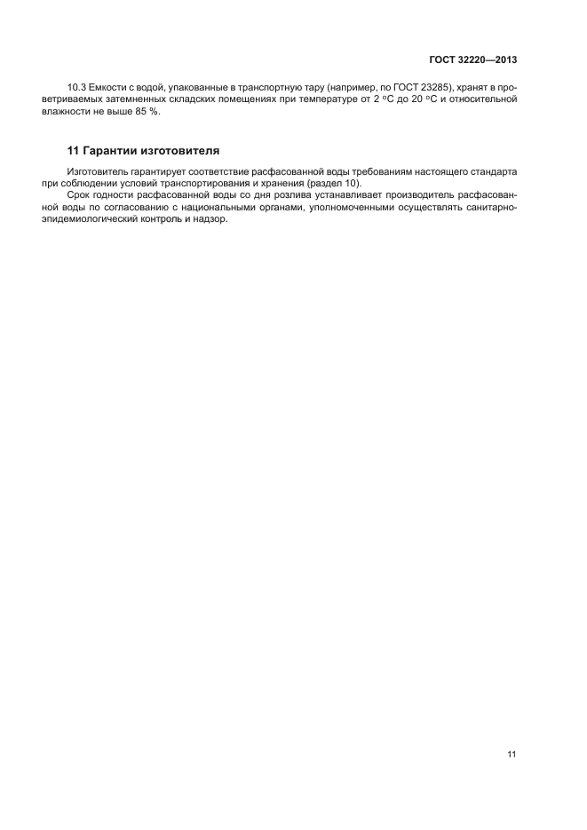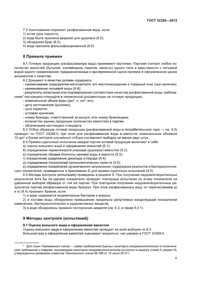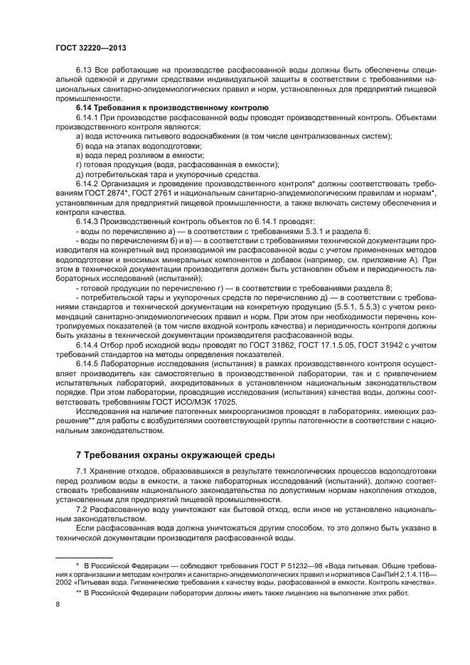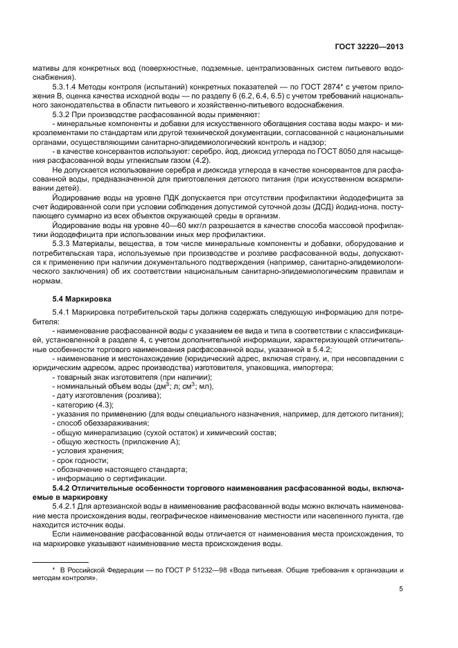 | Область и условия применения: | Настоящий стандарт распространяется на питьевую воду, расфасованную в емкости и предназначенную для питьевых целей, а также для приготовления пищевых продуктов, в том числе детского питания, напитков, пищевого льда, и устанавливает общие требования при ее производстве, поставке, реализации и использовании.
