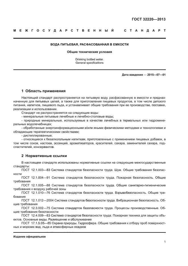 Настоящий стандарт распространяется на питьевую воду, расфасованную в емкости и предназначенную для питьевых целей, а также для приготовления пищевых продуктов, в том числе детского питания, напитков, пищевого льда, и устанавливает общие требования при ее производстве, поставке, реализации и использовании.